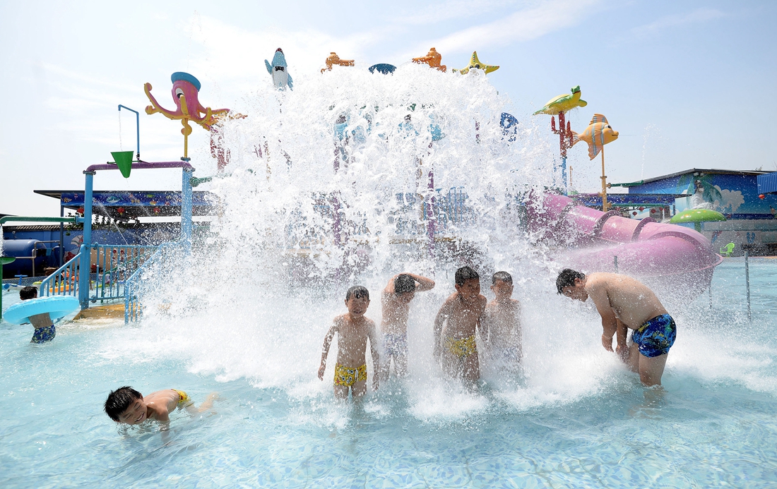 A group of children keep themselves cool at a water paradise in Handan, North China’s Hebei Province on July 23, 2019. Photo: VCG figcaption >
