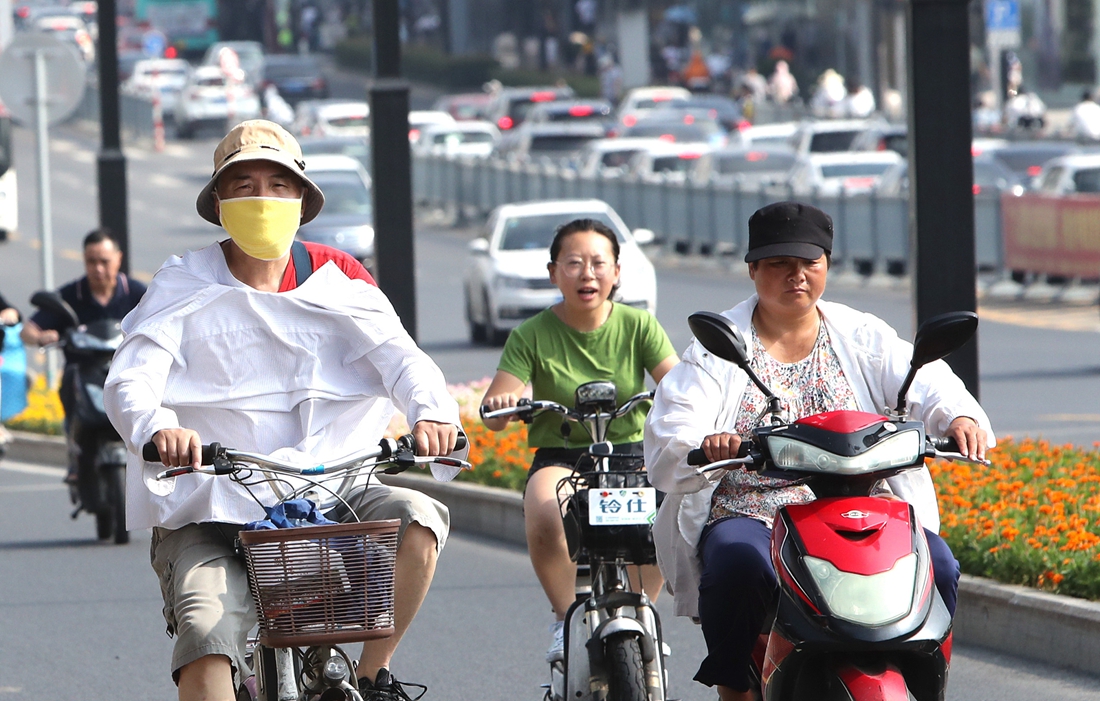 People wear hats and masks to keep themselves cool as a heat wave hit Suzhou, East China’s Jiangsu Province on July 23, 2019. Photo: VCG figcaption >