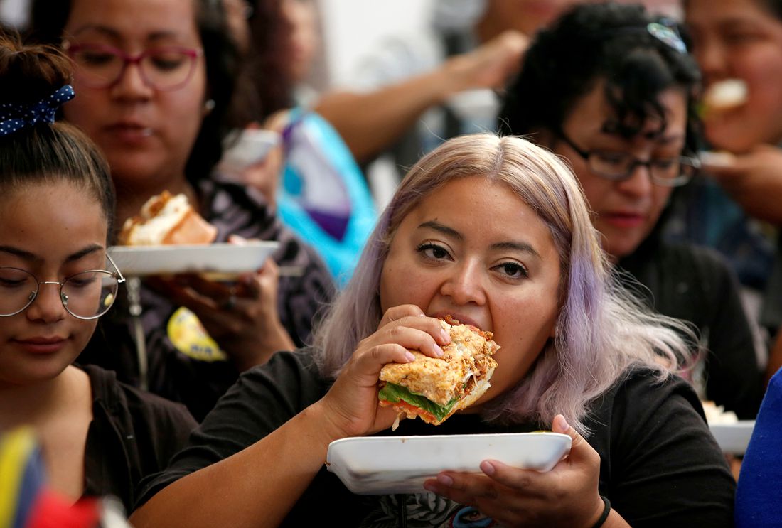 A woman enjoys a piece of the 72-meter long 'torta', or sandwich, prepared in an attempt to break the record for the world's biggest sandwich, in Mexico City, Mexico on July 31, 2019. Photo: Carlos Jasso/VCG figcaption >