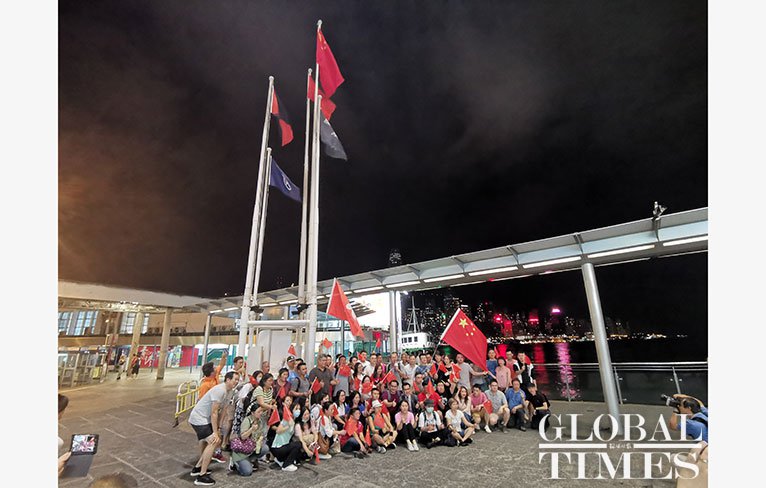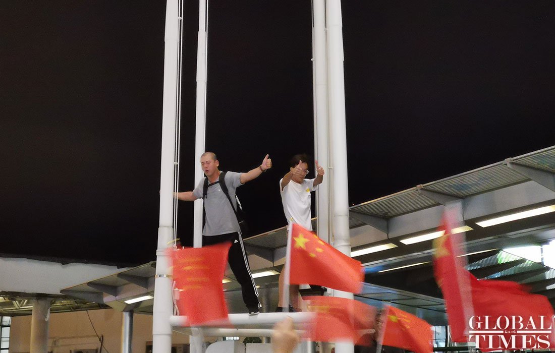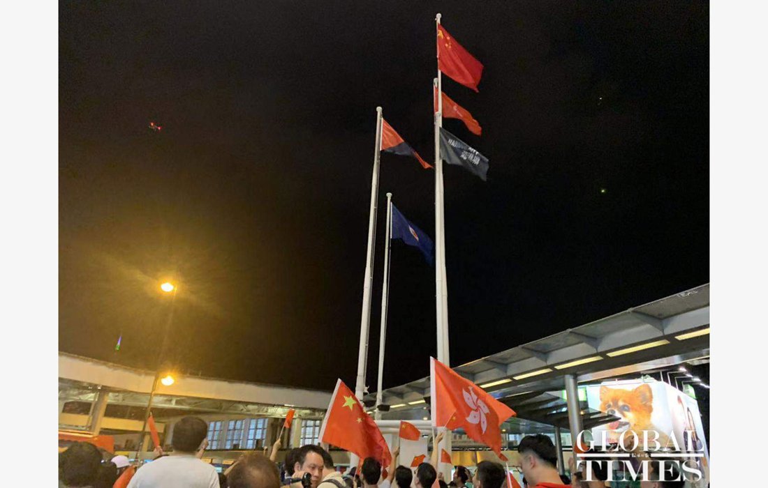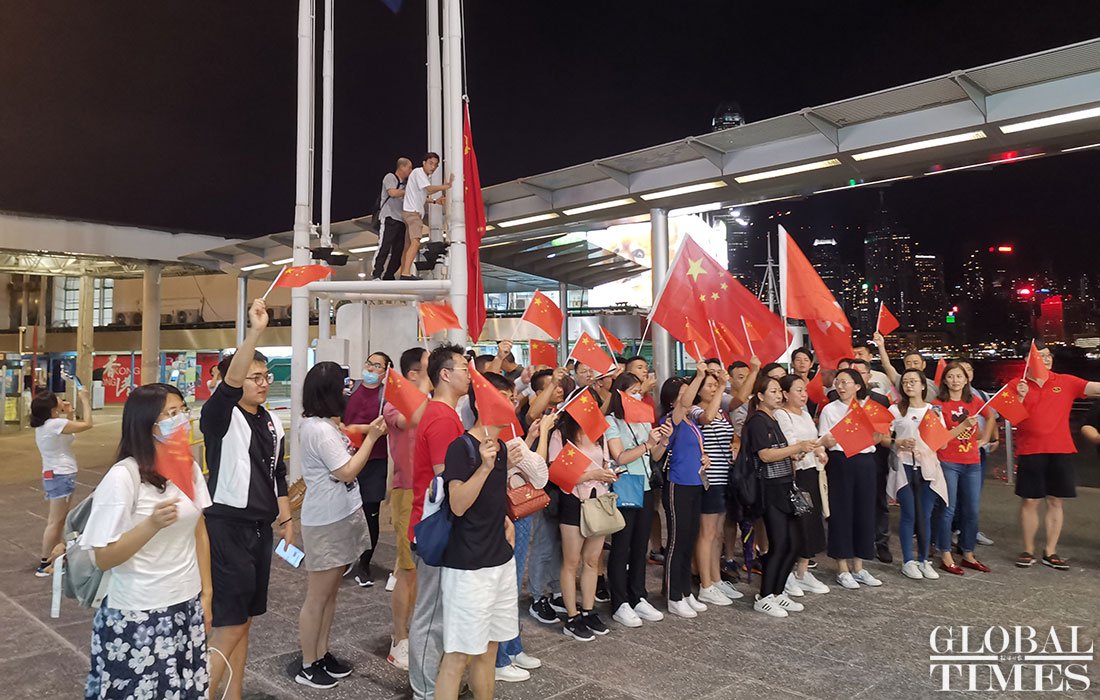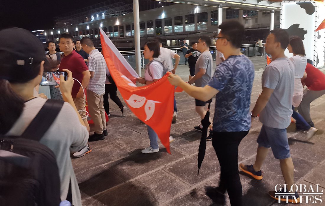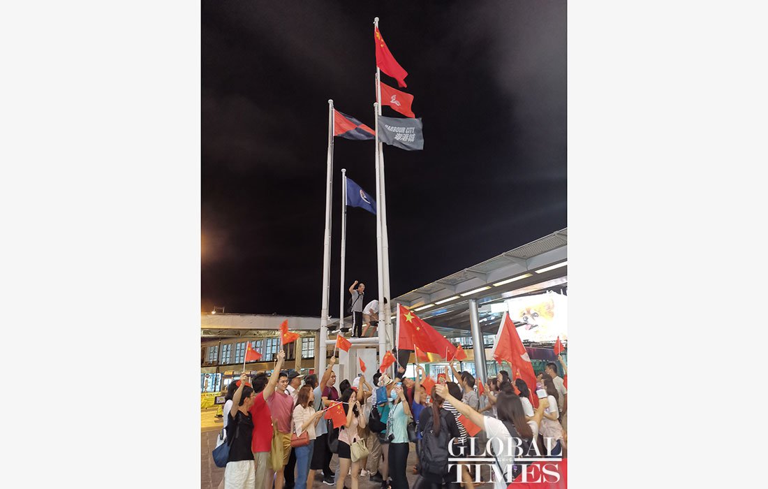 Hong Kong residents raised the Five-Star Red Flag in Victoria Harbor late Monday night, after protesters removed it from the Tsim Sha Tsui Star Ferry Pier and threw it into the harbor earlier the day. This was the second such act in two days. (Photos: Chen Qingqing and Yang Sheng/GT)
