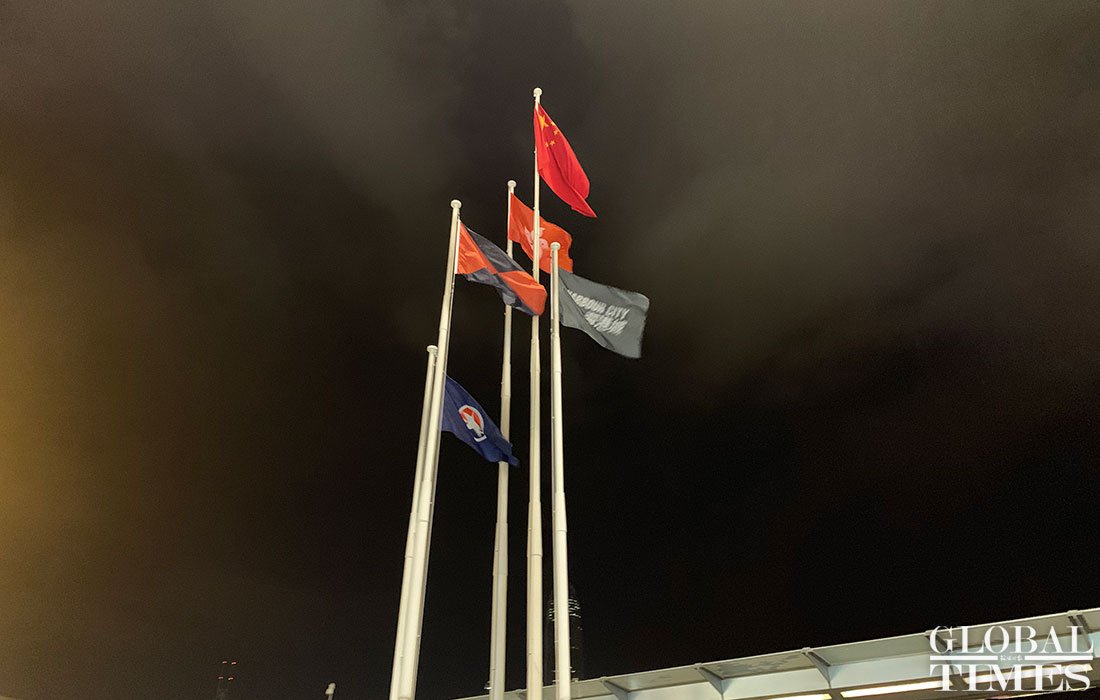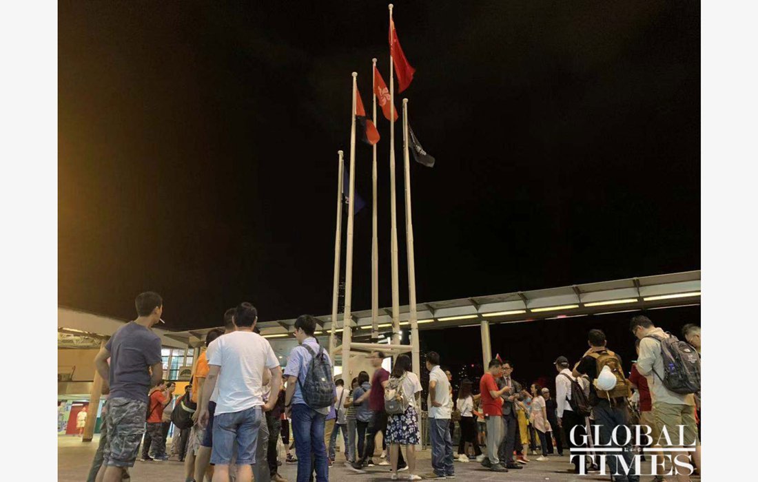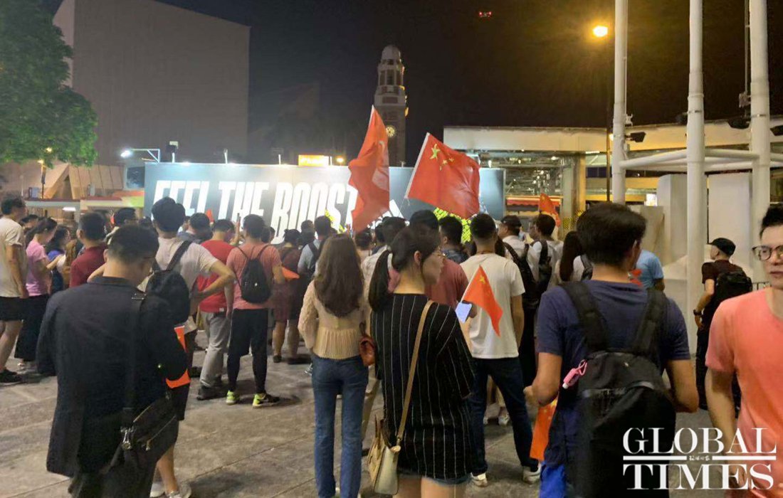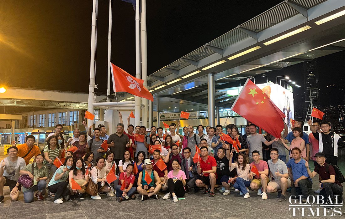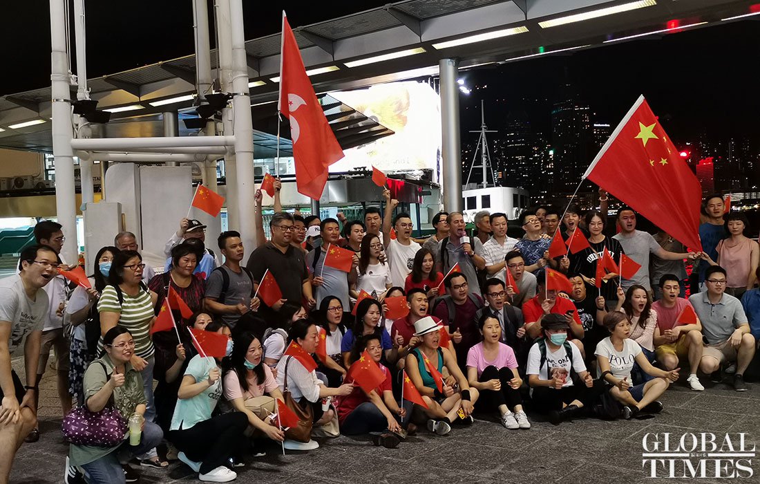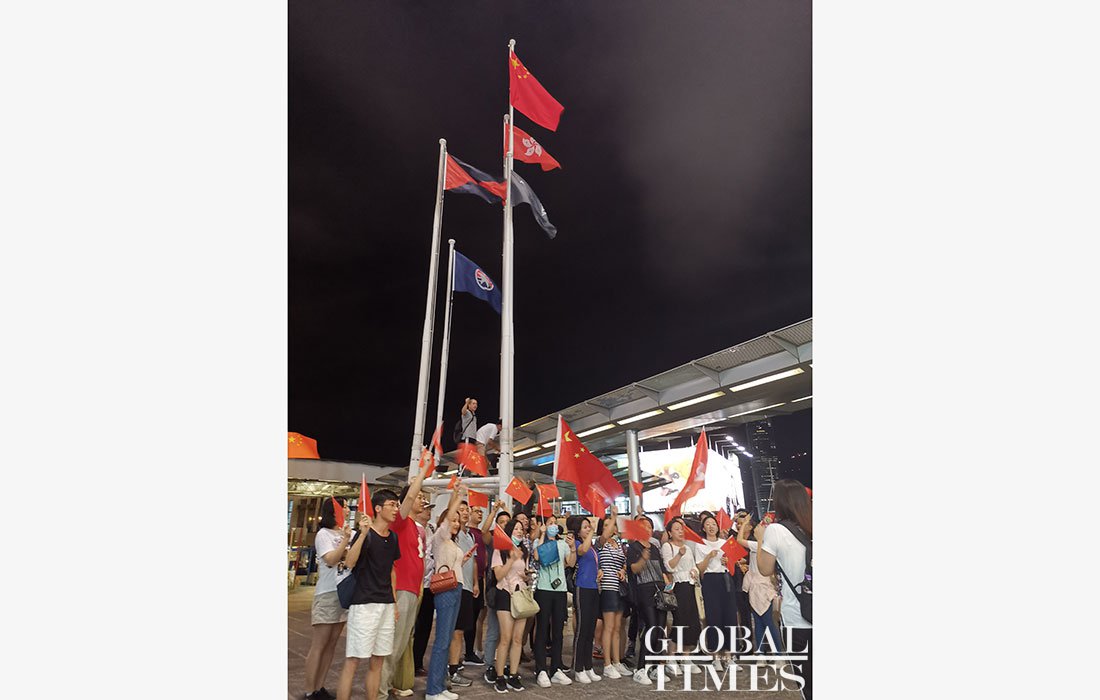 Hong Kong residents raised the Five-Star Red Flag in Victoria Harbor late Monday night, after protesters removed it from the Tsim Sha Tsui Star Ferry Pier and threw it into the harbor earlier the day. This was the second such act in two days. (Photos: Chen Qingqing and Yang Sheng/GT)