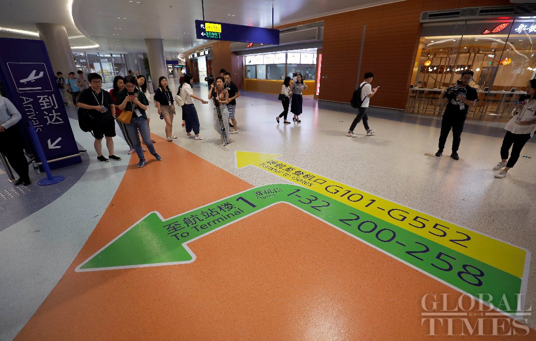 Demarcation signs in the satellite hallhelp passengers with transfers and boarding . Photo: Yang Hui/GT figcaption >