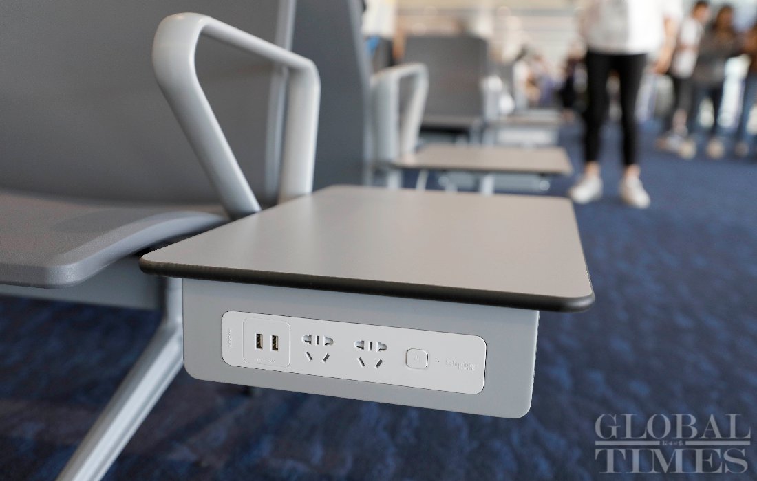 Seats in the airport premises are equipped with power plugs. . Photo: Yang Hui/GT figcaption >