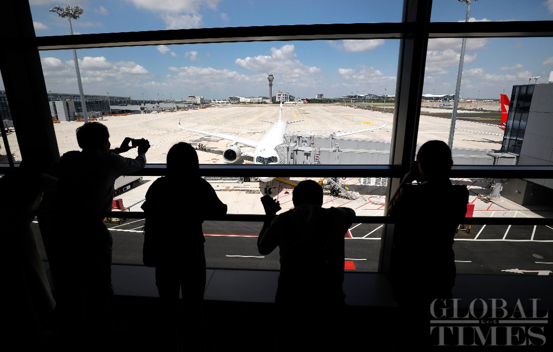 Passengers peer from a new boarding bridge and take photos of a taxied aircraft on Monday. Photo: Yang Hui/GT
