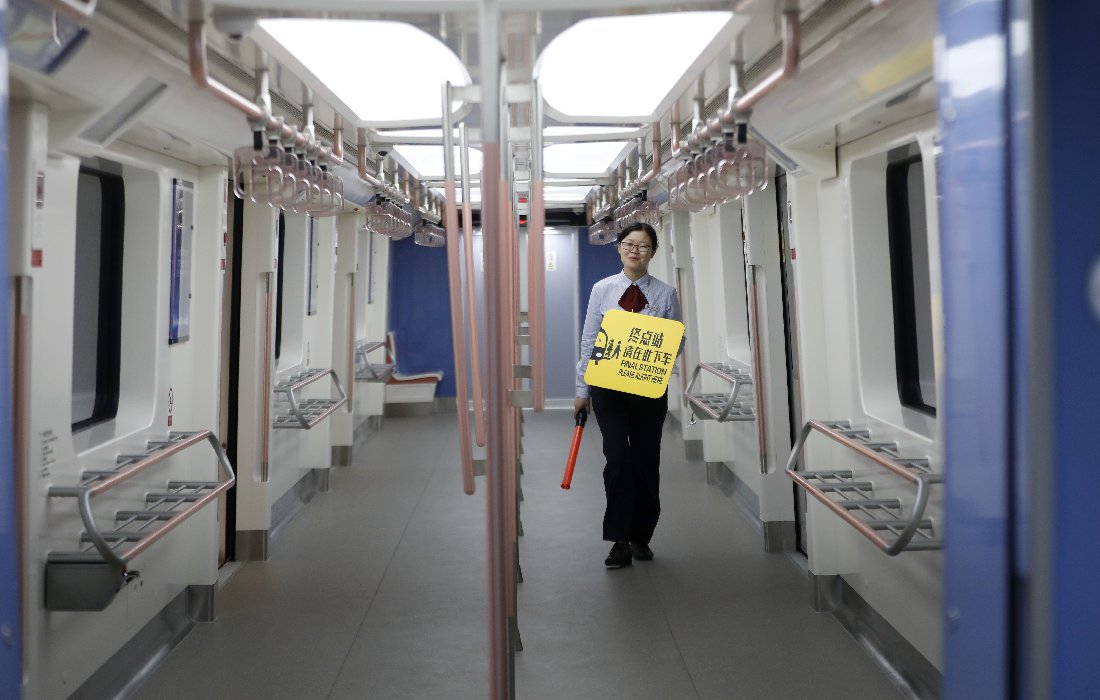 An airport staff gestures arrival inside the Pudong International Airport Rapid Transit System. Photo: Yang Hui/GT figcaption >
