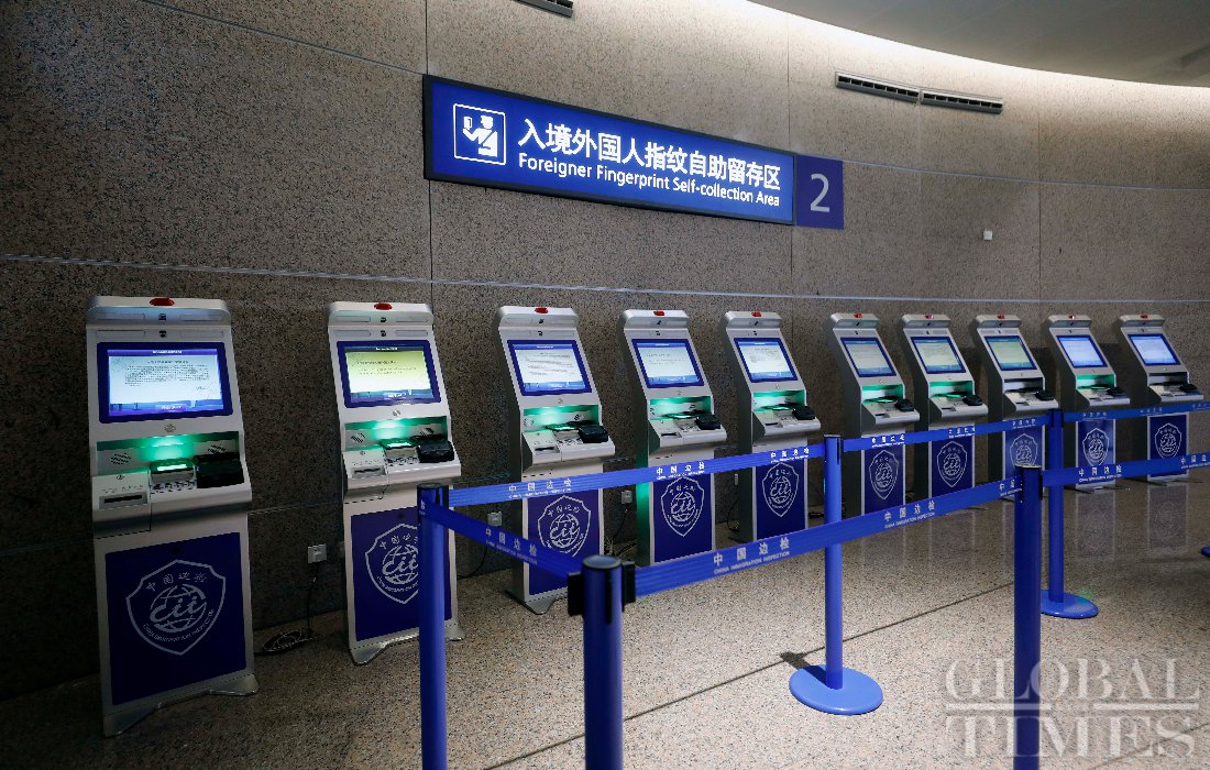 Self-serviced fingerprint collection booths for foreigners in the airport on Sep 16. Photo: Yang Hui/GT figcaption >