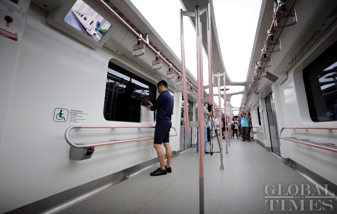 Passengers stand inside the Pudong International Airport Rapid Transit System on Monday. Photo: Yang Hui/GT figcaption >