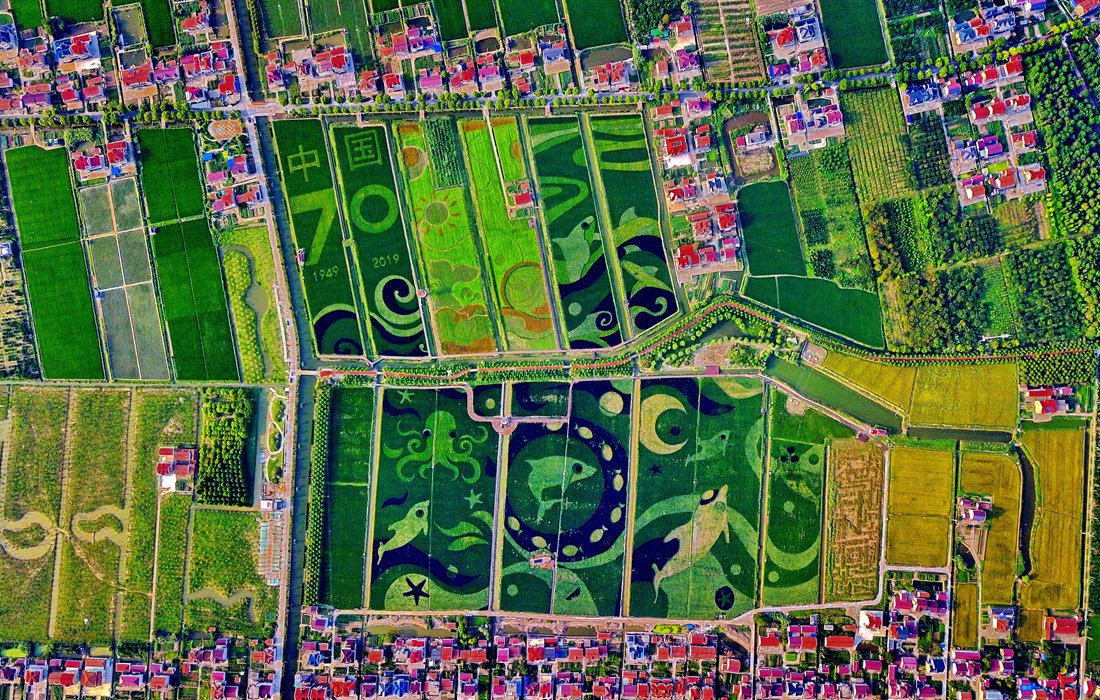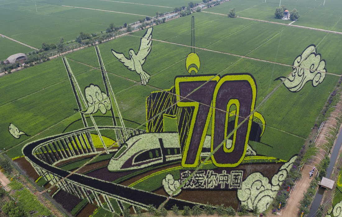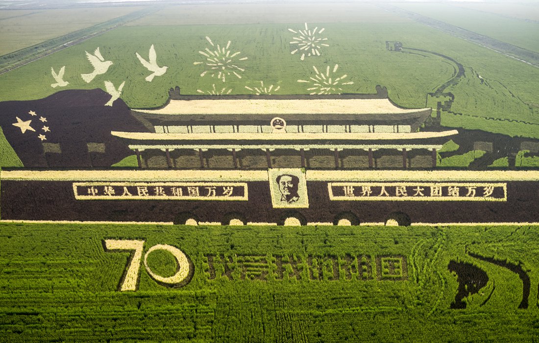 Chinese citizens paint national flags and blessings on the farmland using natural resources to celebrate 70th anniversary of the founding of the People’s Republic of China.