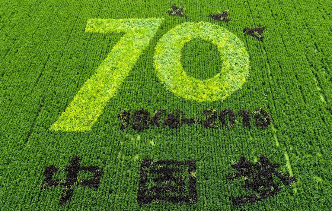 Paintings celebrating the 70th anniversary displayed on a rice cultivation field in a village in Shanghai using five different colors figcaption >