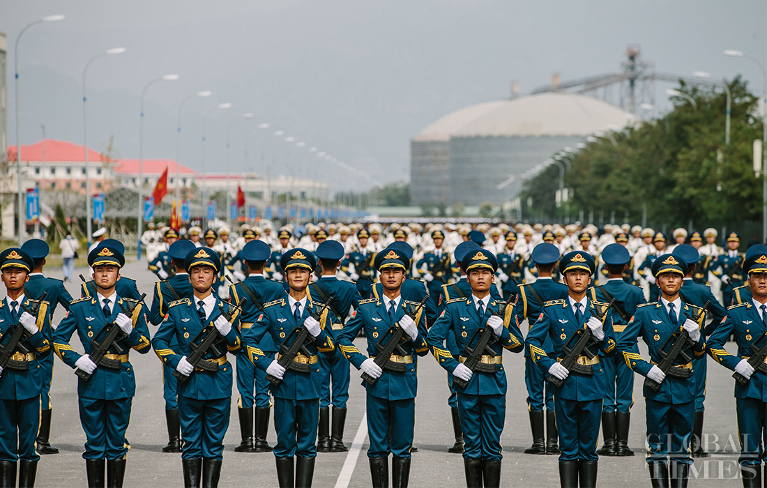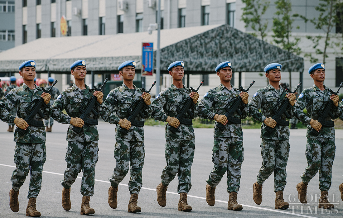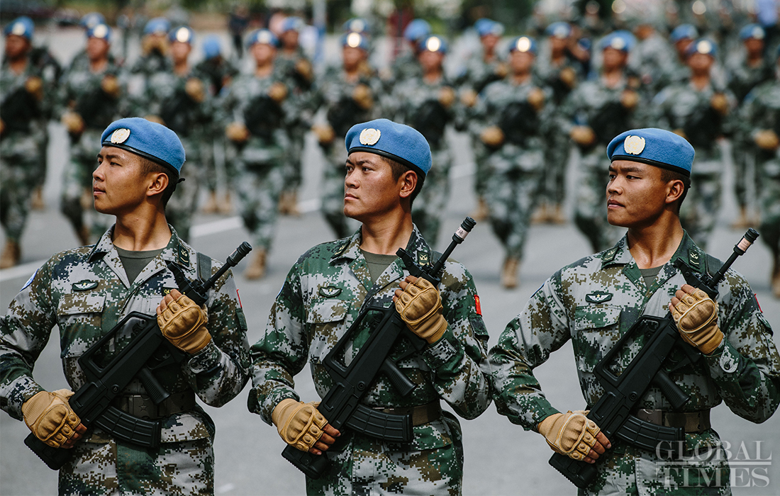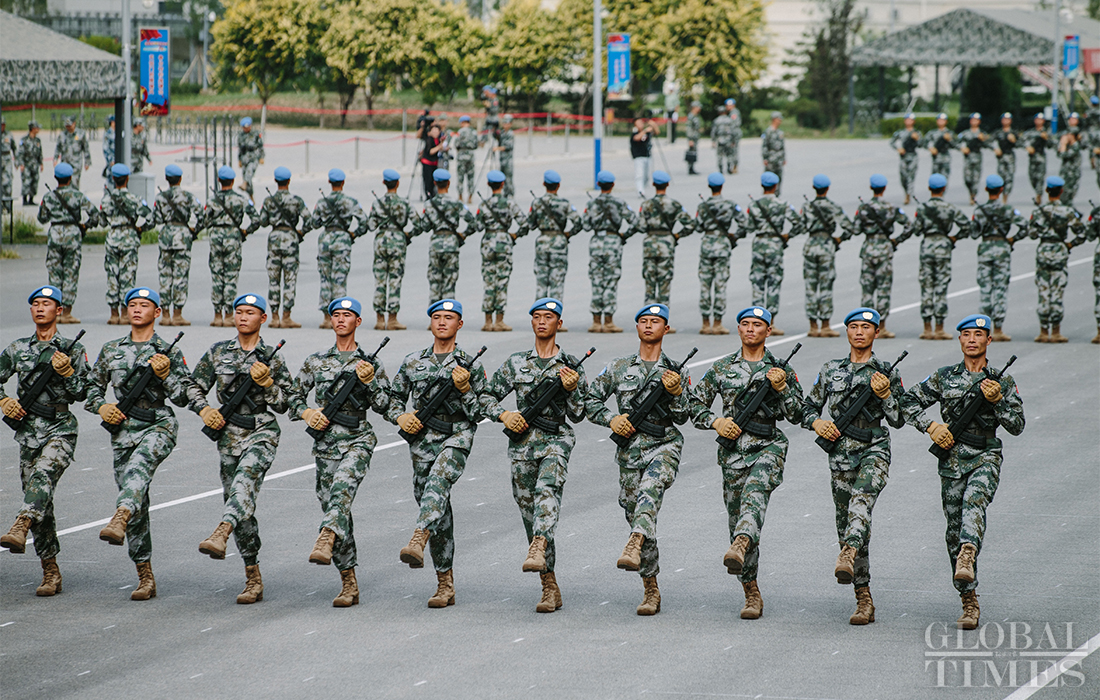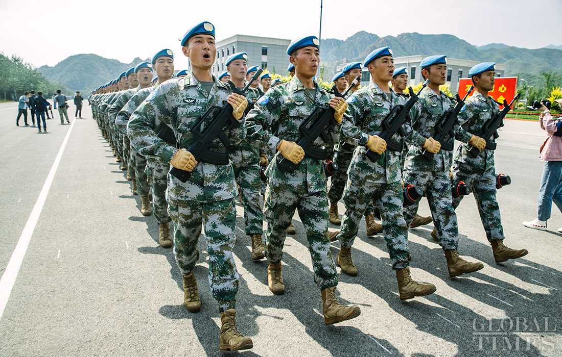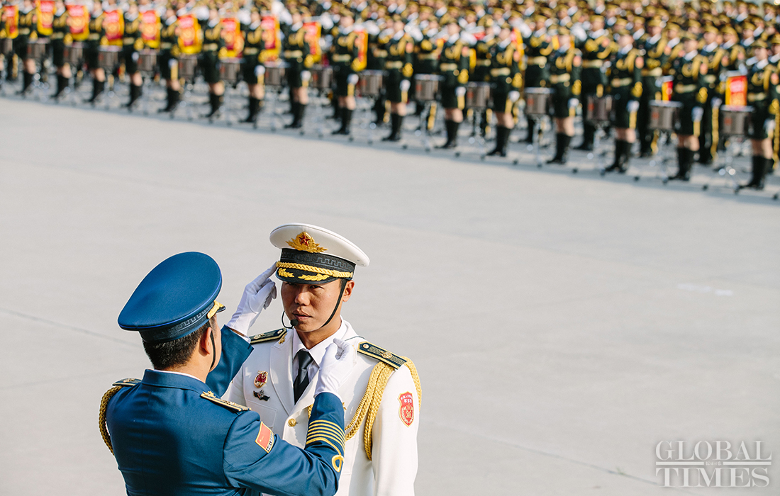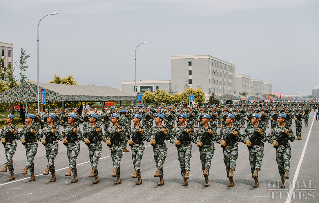 In preparation of the 70th National Day parade, the phalanx of Chinese peacekeeping force conduct training at the parade training center in Changping district, Beijing, on September 17, 2019. Photo: Li Hao/GT figcaption >