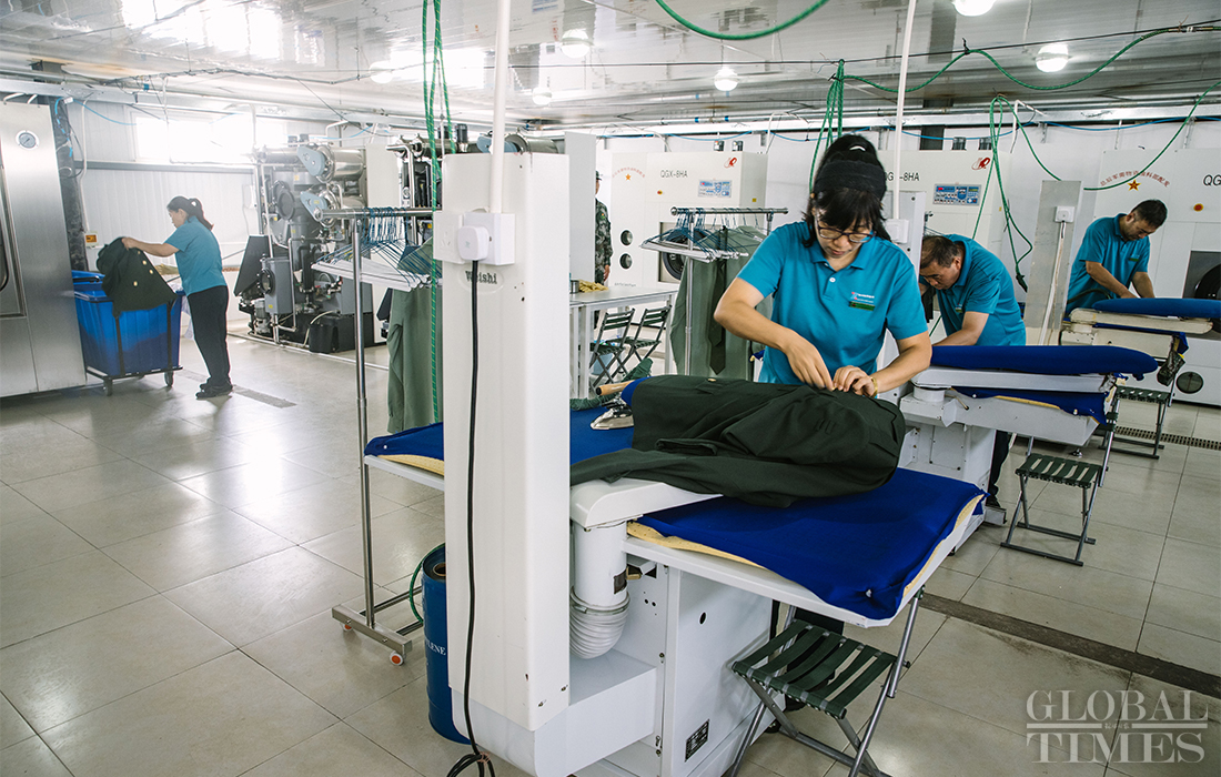 Staff members wash, dry clothes of parade training participants at the parade training center in Changping district, Beijing on September 17, 2019. Photo: Li Hao/GT figcaption >