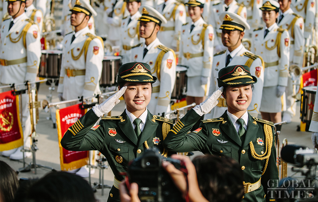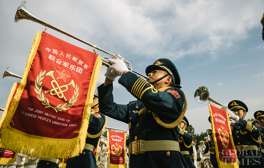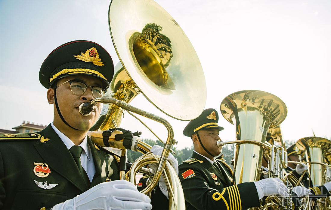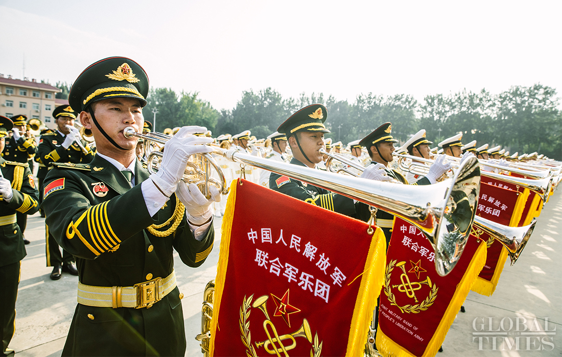 In preparation of the 70th National Day parade, the Joint Military Band of the Chinese People’s Liberation Army conduct training at the parade training center in Changping district, Beijing, on September 17, 2019. Photo: Li Hao/GT figcaption >