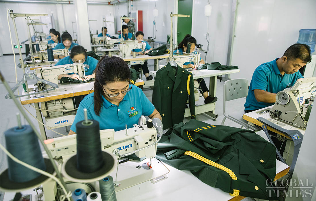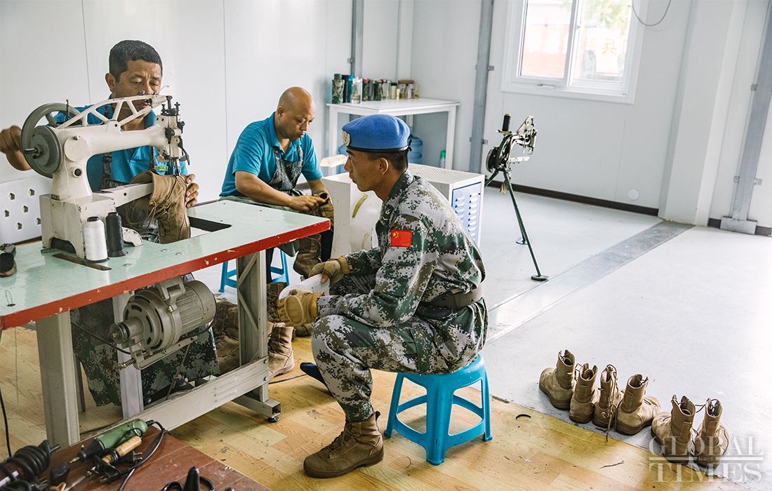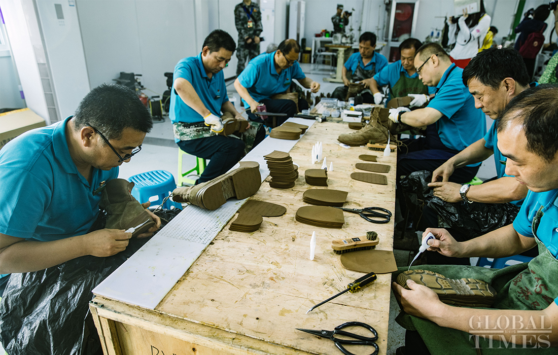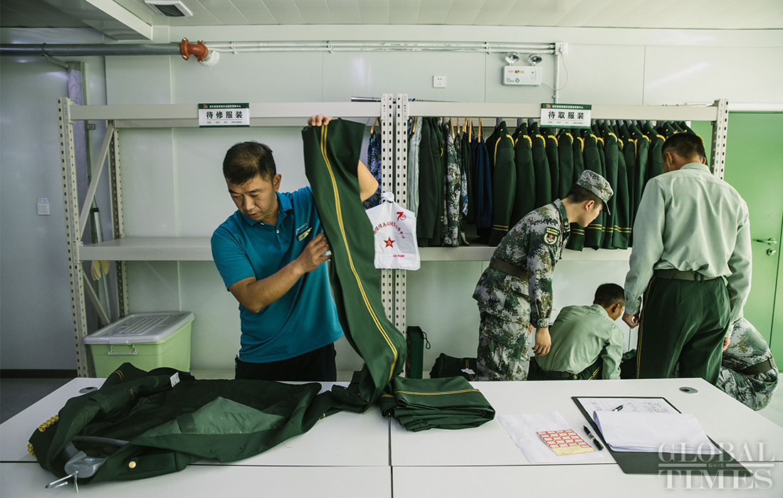 Staff members at a tailor center in the parade training center in Changping district, Beijing adjust and repair clothes and shoes for participants of the parade training on September 17, 2019. Photo: Li Hao/GT figcaption >