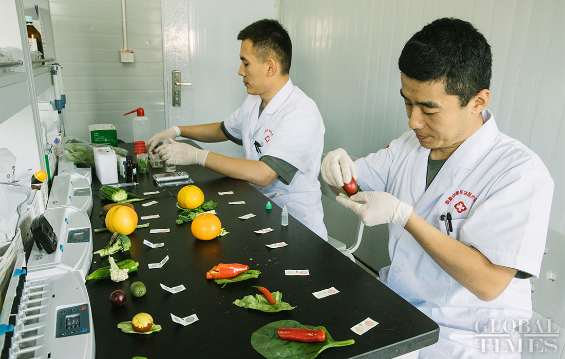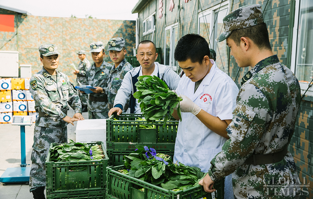 Upon arrival at the parade training center in Changping district, Beijing on September 17, 2019, food ingredients are carefully examined for quality. Photo: Li Hao/GT figcaption >