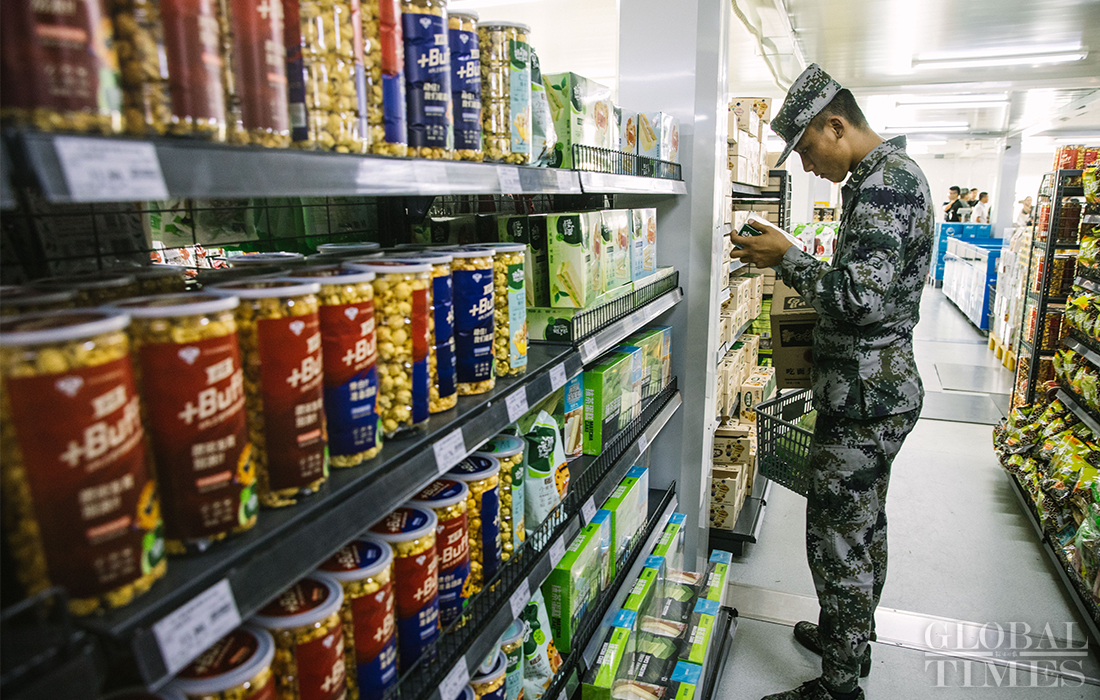 A parade training participant chooses goods at a supermarket in the parade training center in Changping district, Beijing on September 17, 2019. Photo: Li Hao/GT figcaption >