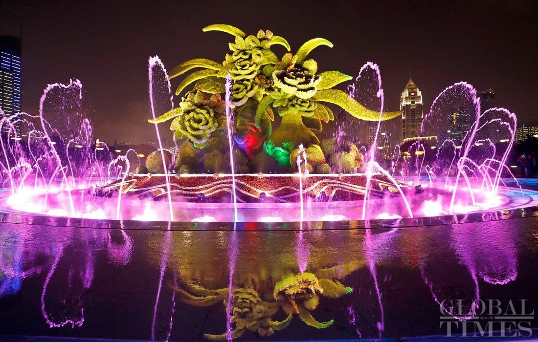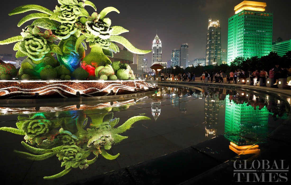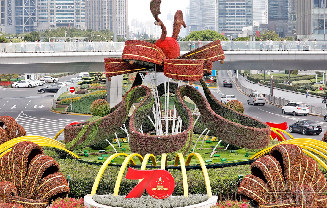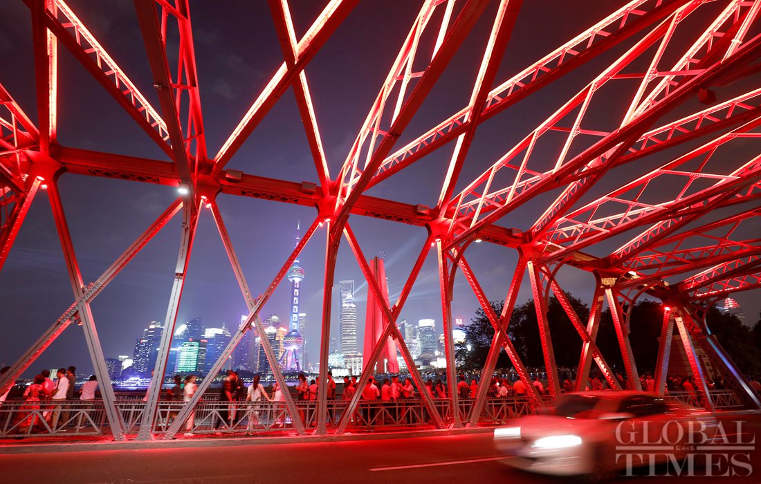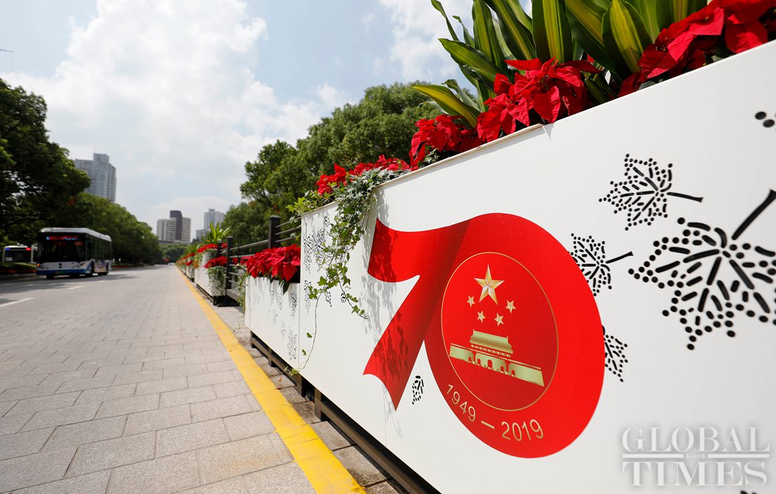 As the National Day holidays approach, there is a big wave of action on the landscape in Shanghai: Chinese national flags are hung along Nanjing Pedestrian Street; the flower beds are newly unveiled; the Bund area is decorated with a flower wall; the 112-year-old Waibaidu Bridge also renewed its lighting group... The entire city celebrates the 70th anniversary of the founding of the People's Republic of China in a hot and peaceful atmosphere. Photos: Yang Hui/GT