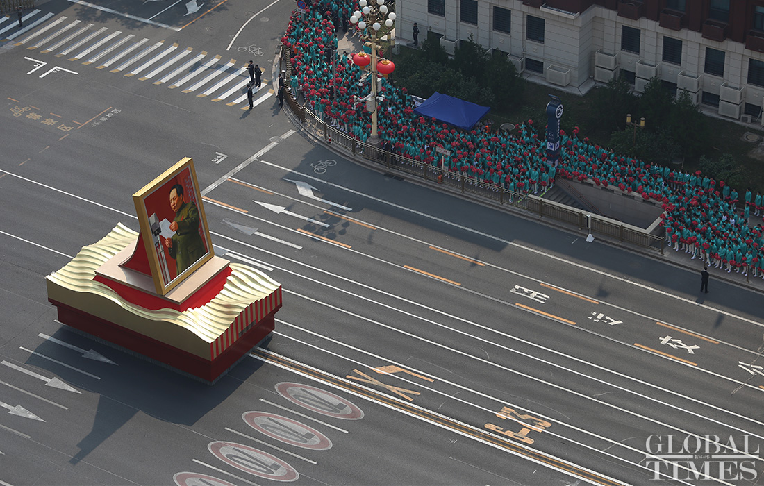 A float carrying a large portrait of late Chinese leader Mao Zedong approaches the Tiananmen Square. Photo: Fan Lingzhi/GT figcaption >