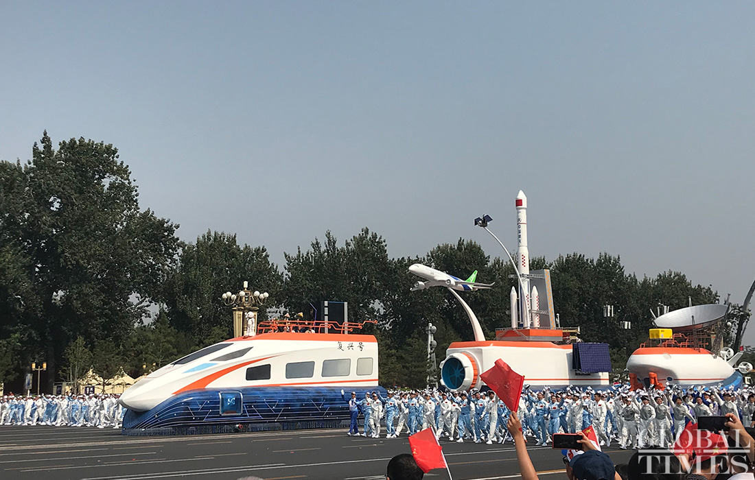 A float showing China’s technological breakthroughs including the self-developed Fuxing bullet train passes Tiananmen Square. Photo: Fu Guohao/GT figcaption >