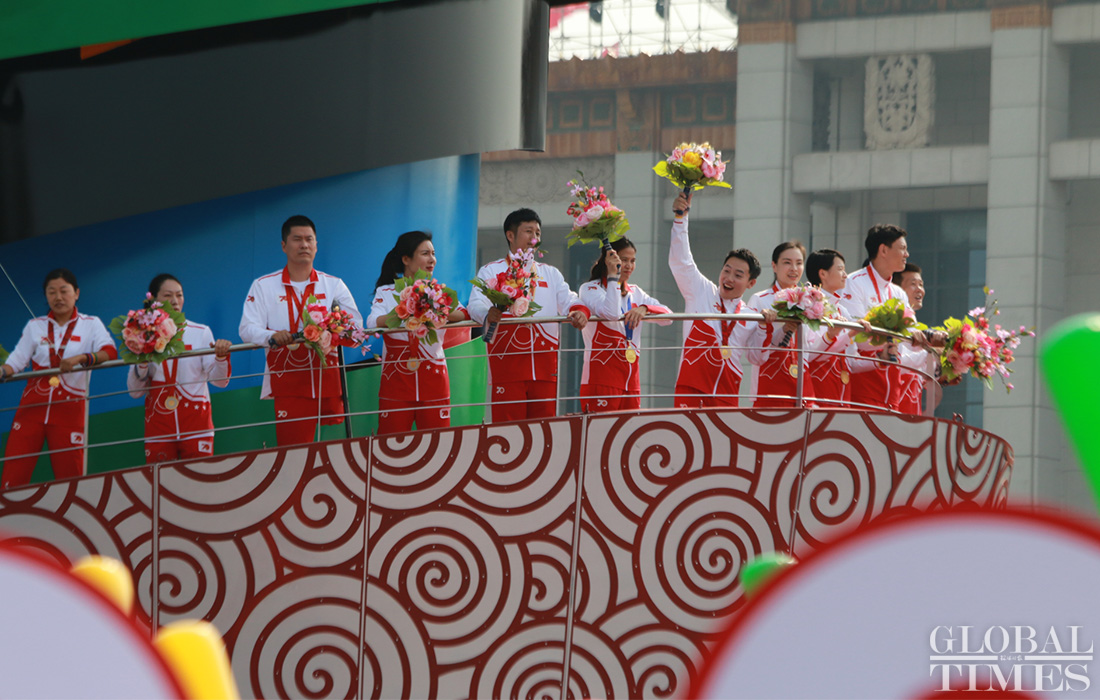Chinese gold medalists of the 2008 Olympics board a float. China hosted the 29th Olympic Games in Beijing in 2008 and topped the medal tally with 100 medals in total, including 48 gold. Photo: He Zhuoqian/GT figcaption >