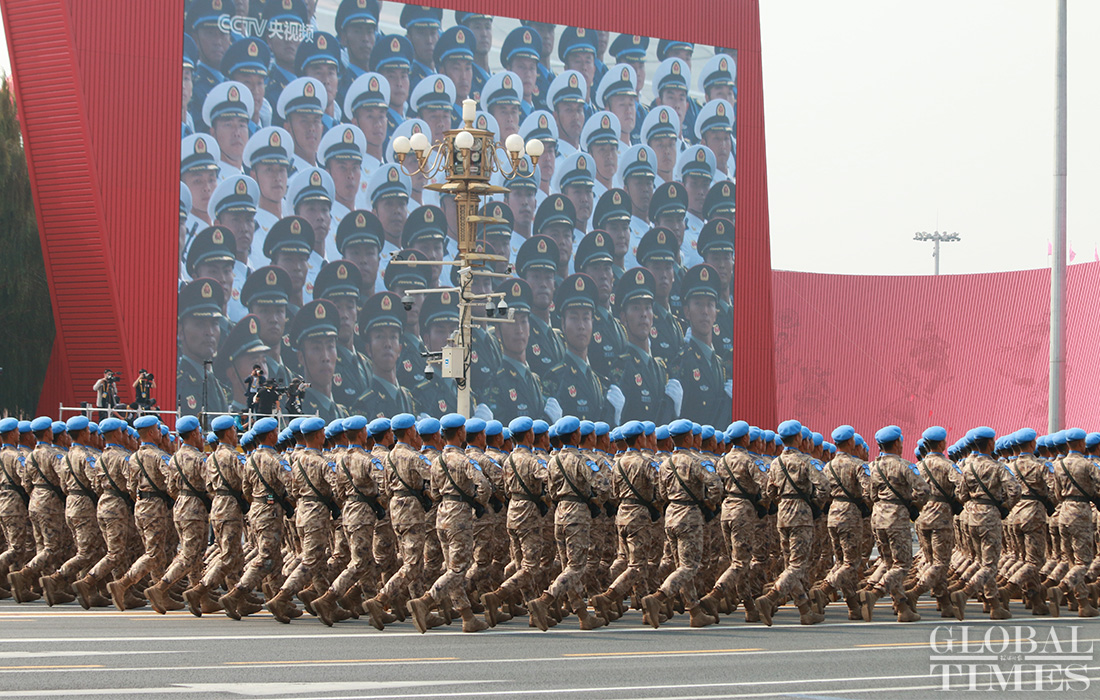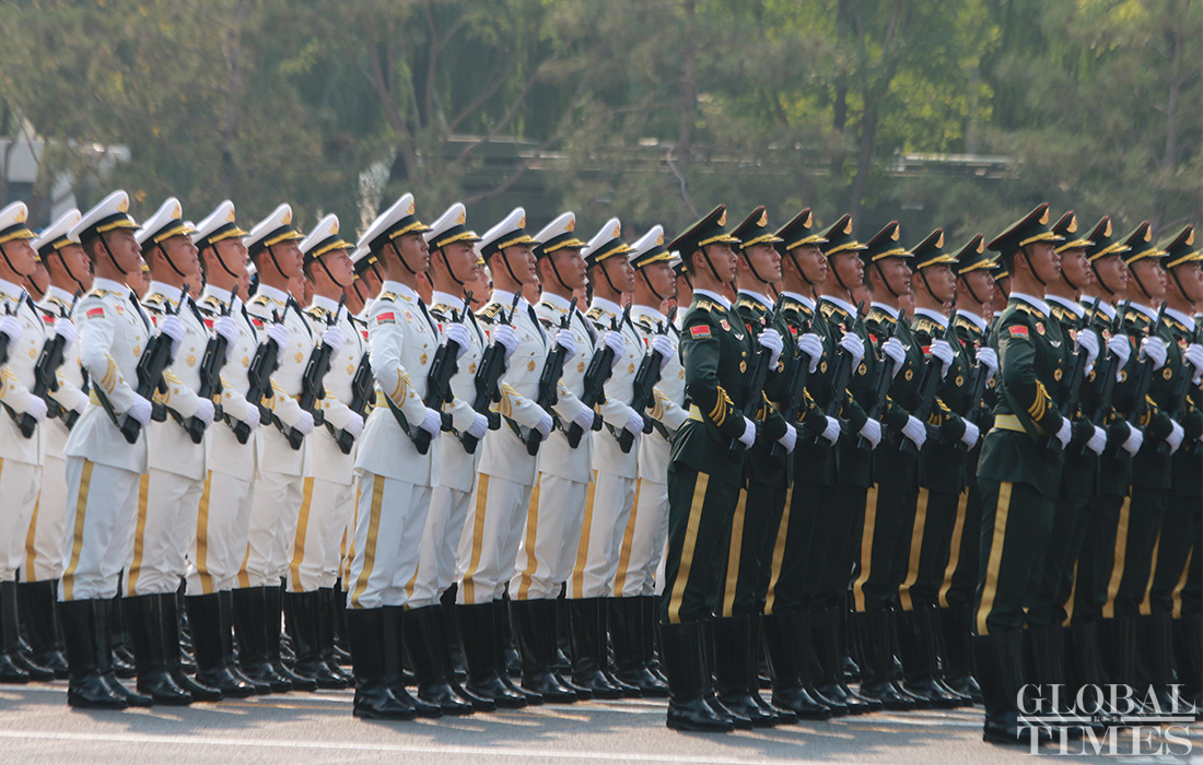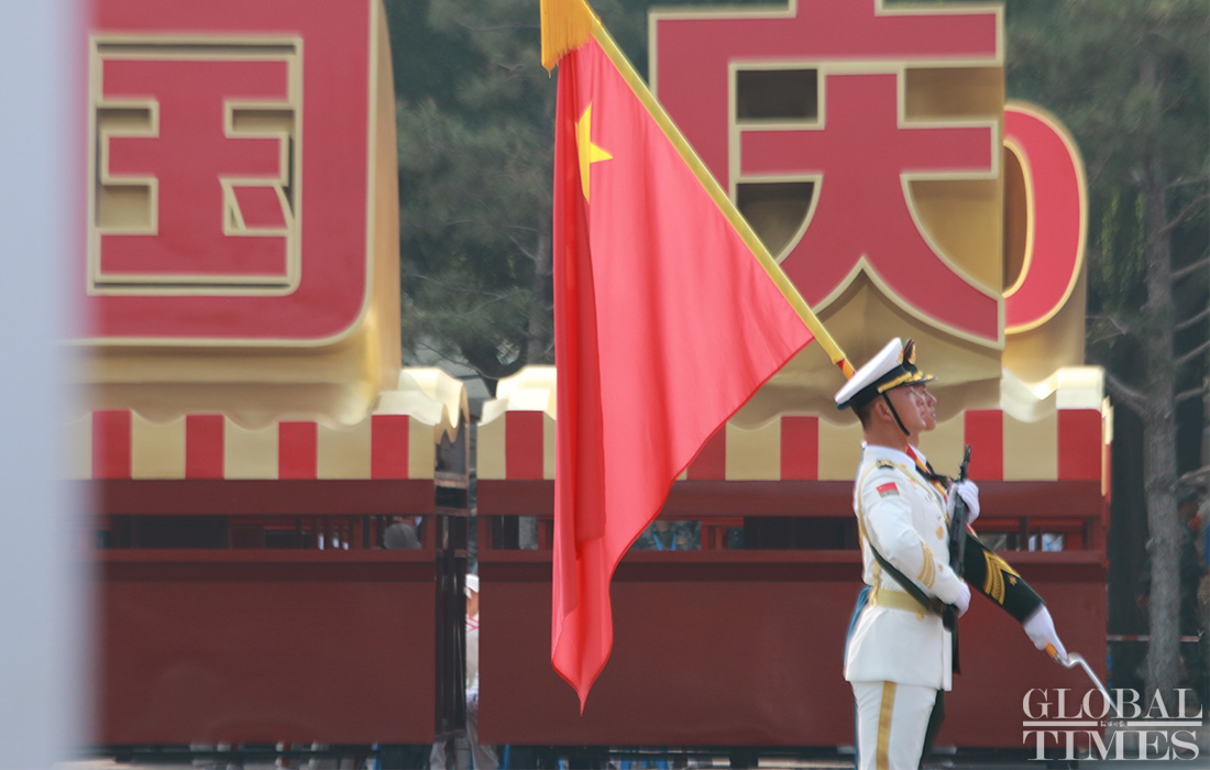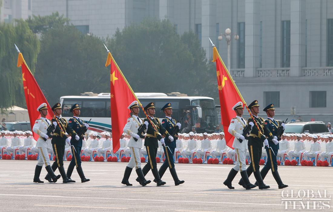 The PLA guard of honor escorts the flag of the Communist Party of China (CPC), the national flag, and the People's Liberation Army (PLA) flag during the parade. Photo: He Zhuoqian/GT