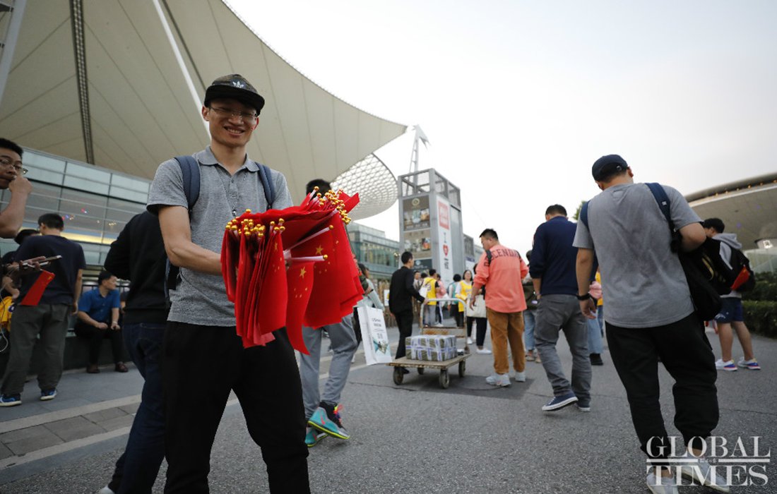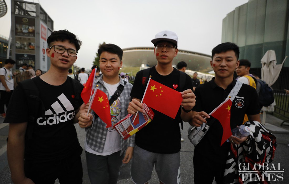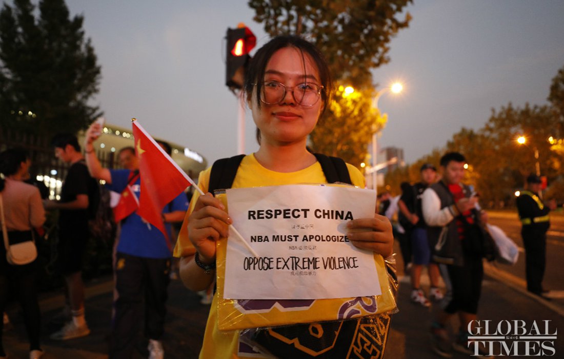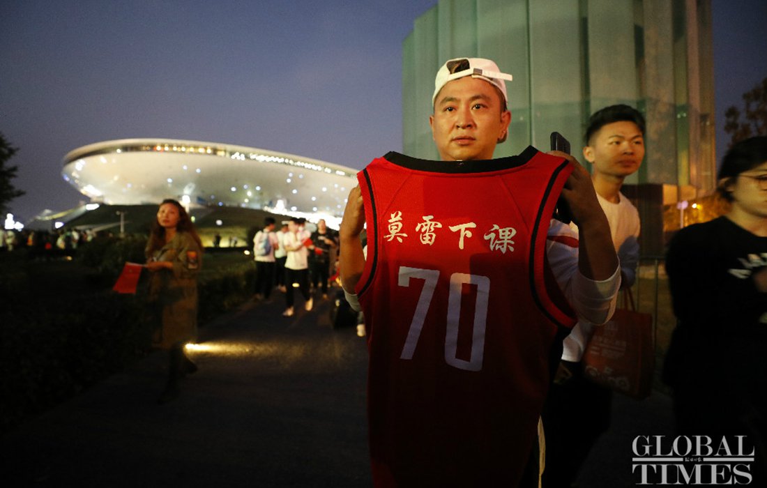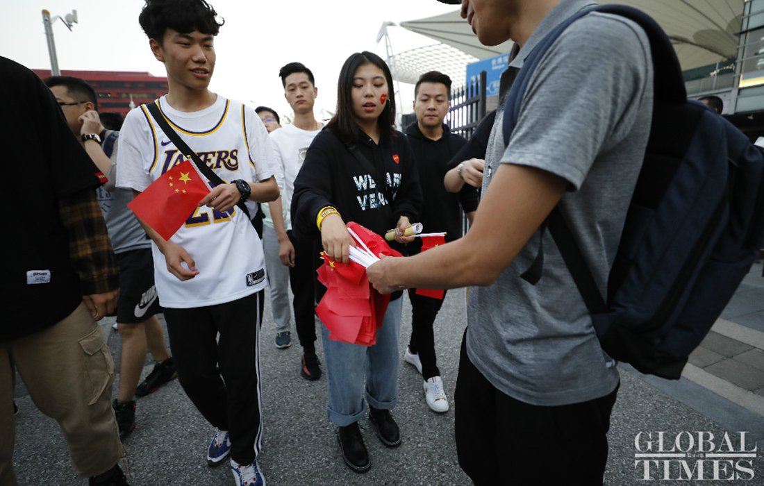 The NBA pre-season game between the Brooklyn Nets and Los Angeles Lakers is held at the Mercedes-Benz Cultural Center in Shanghai on Wednesday night. Chinese fans distribute the national flag ahead of the game as a fan is seen holding a jersey asking Daryl Morey to resign.Photos:Yang Hui/GT