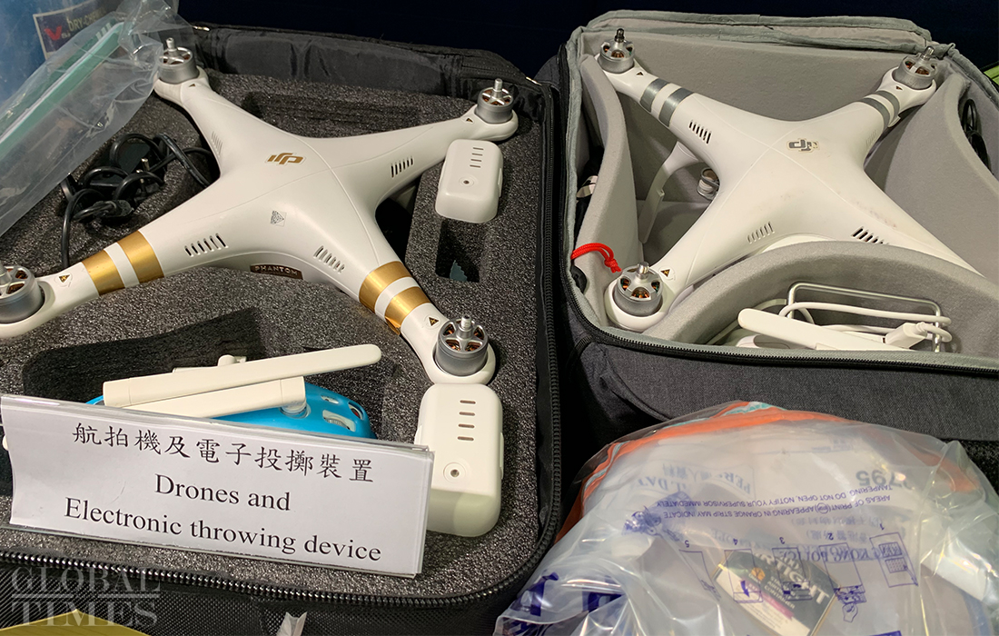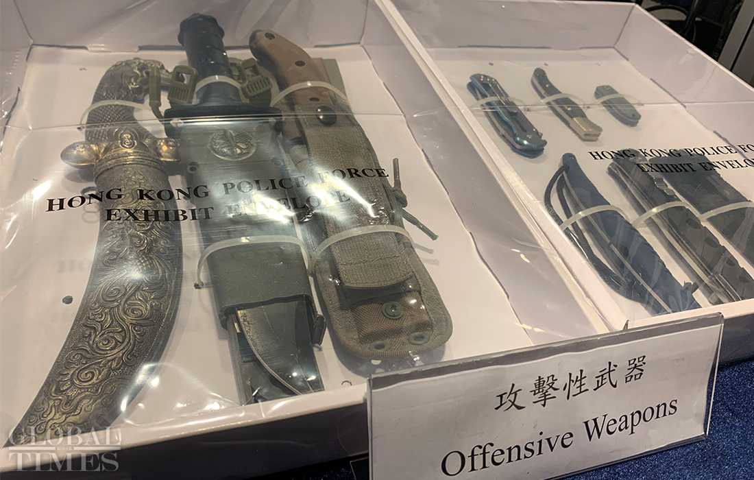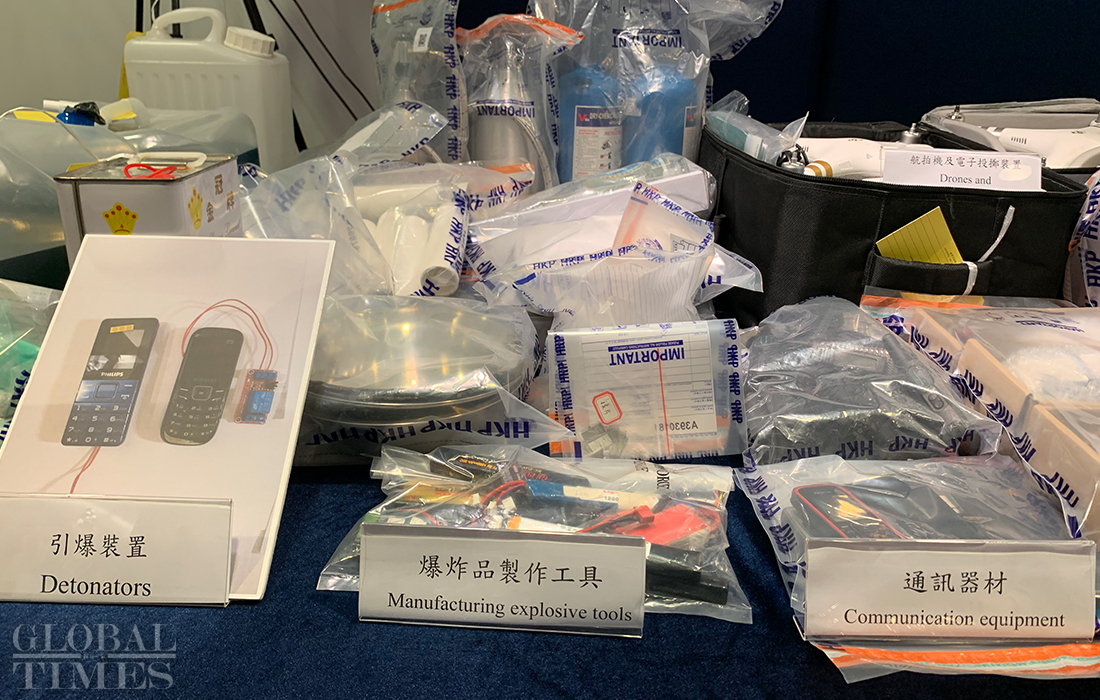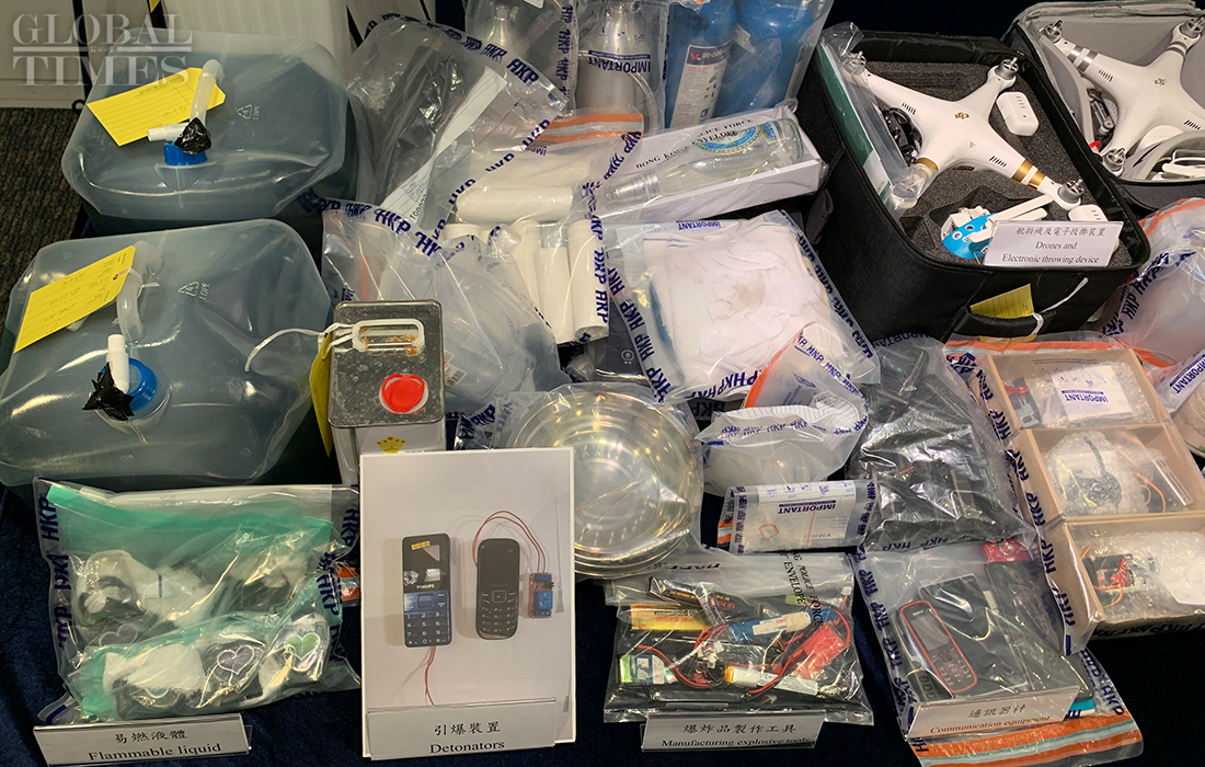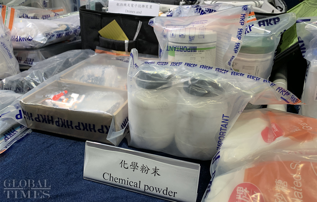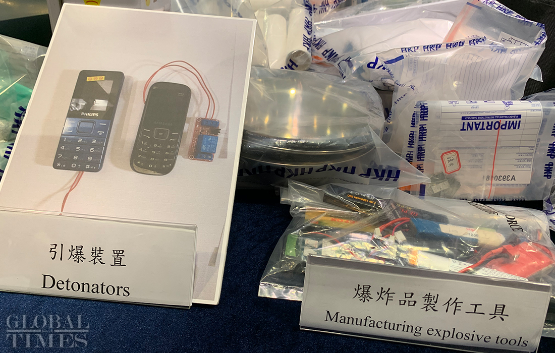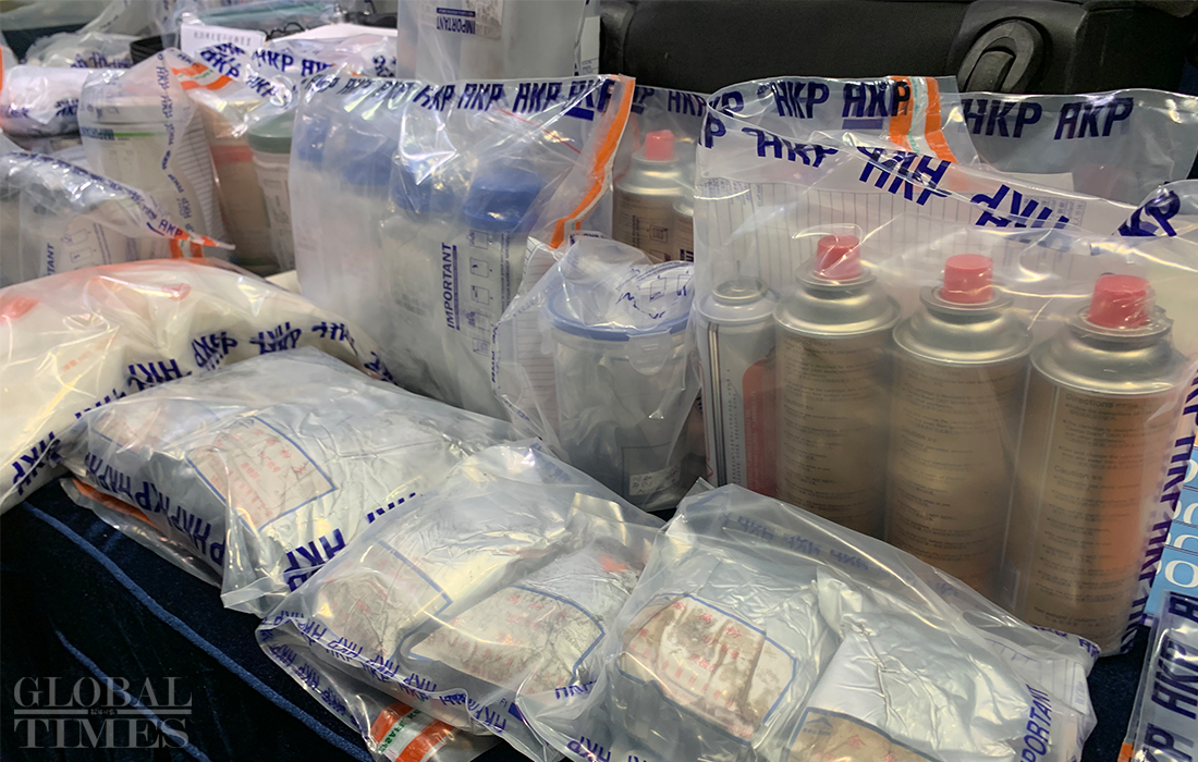 Detonators, chemical powder, and flammable liquid. Hong Kong police on Wednesday displayed many types of weapons that rioters used to inflict their attacks. Photos: Zhao Juecheng/GT