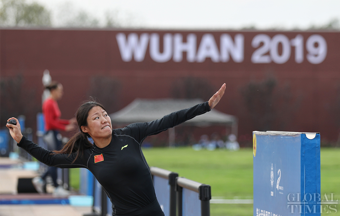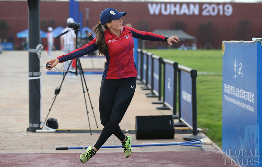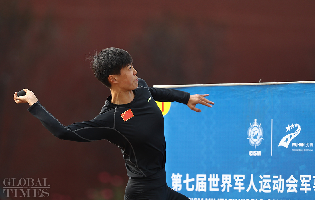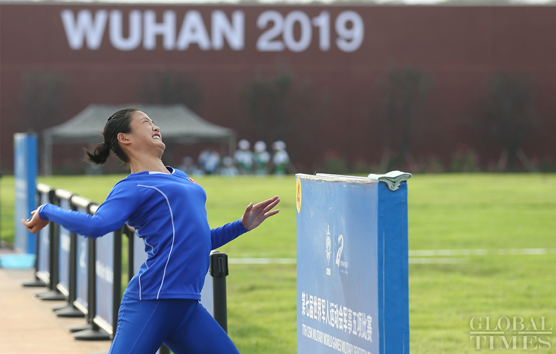 Chinese athlete Guan Chaonan wins first place in the women’s throwing event of the military pentathlon on Monday in Wuhan, Central China’s Hubei Province. Photo: Cui Meng/GT