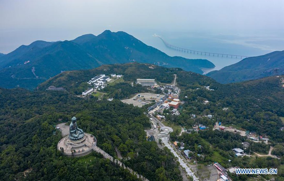 Photo taken on Oct. 24, 2019 shows a view of the Hong Kong-Zhuhai-Macao Bridge from the "Ngong Ping 360" cable car in south China's Hong Kong. Launched on Oct. 23 last year, the 55-km bridge, known as the longest bridge-and-tunnel sea crossing in the world, links China's Hong Kong Special Administrative Region (SAR), the city of Zhuhai of southern Guangdong Province and Macao SAR, making it more convenient for ordinary people to travel the three places in a single day. (Xinhua/Cheong Kam Ka)