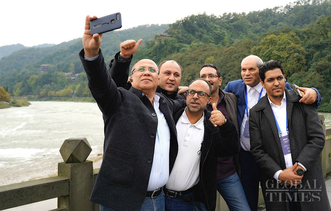 Arab journalists take selfies on the riverbank of the Dujiangyan Irrigation System. Photo: Huang Yiran/GT figcaption >