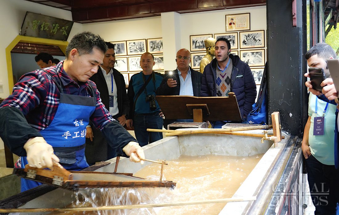 Foreign journalists watch the traditional craft of papermaking at a souvenir shop in Chengdu’s Dujiangyan Irrigation System. Photo: Huang Yiran/GT figcaption >