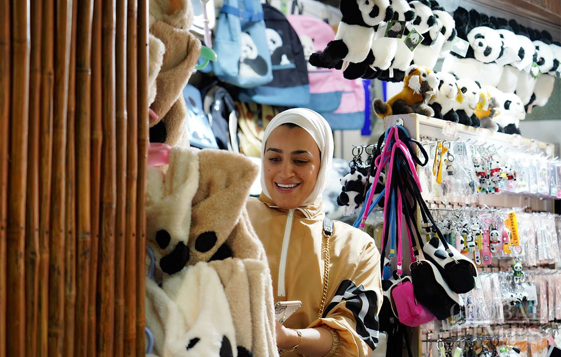A journalist from the United Arab Emirates browses through some panda-themed products sold at a souvenir shop in Chengdu Research Base of Giant Panda Breeding. Photo: Huang Yiran/GT figcaption >
