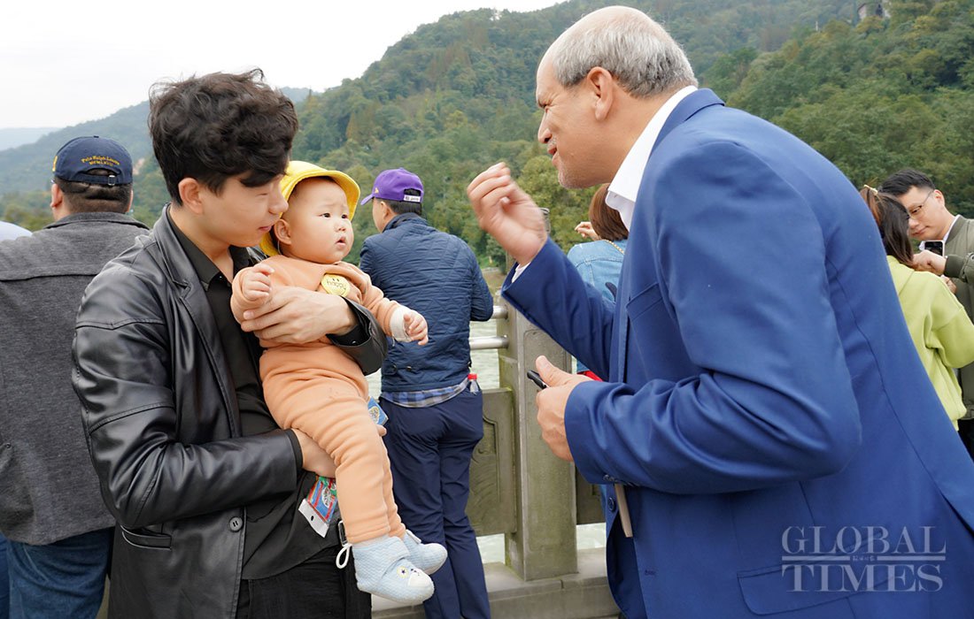 A journalist plays with a toddler in Chengdu’s Dujiangyan irrigation system. Photo: Huang Yiran/GT figcaption >