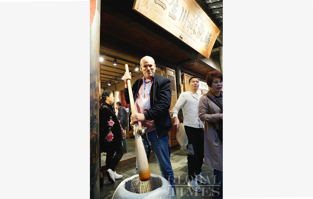A Tunisian journalist pestles chilies at a store in Chengdu’s famous ancient street – Jinli. Photo: Huang Yiran/GT figcaption >