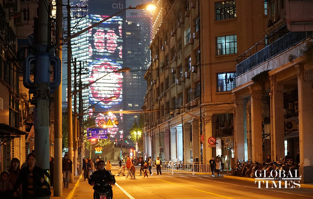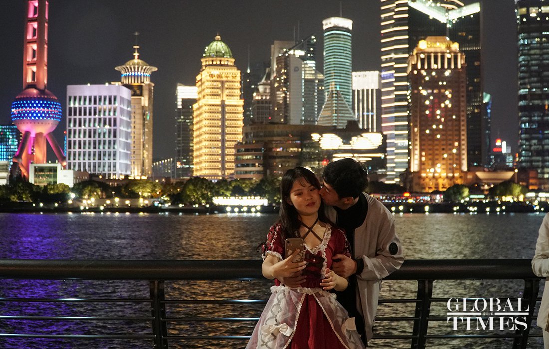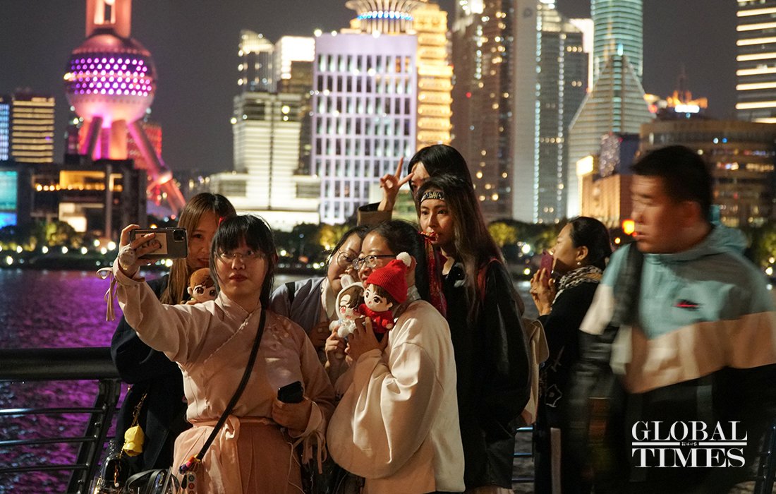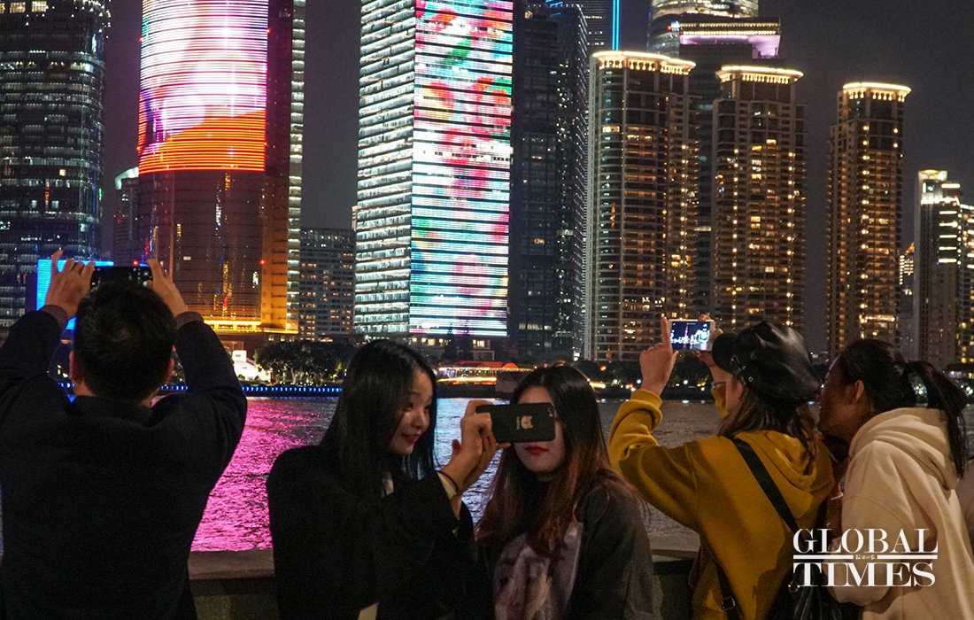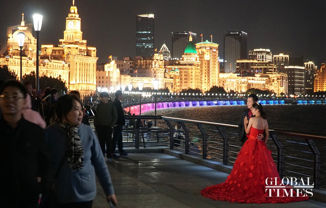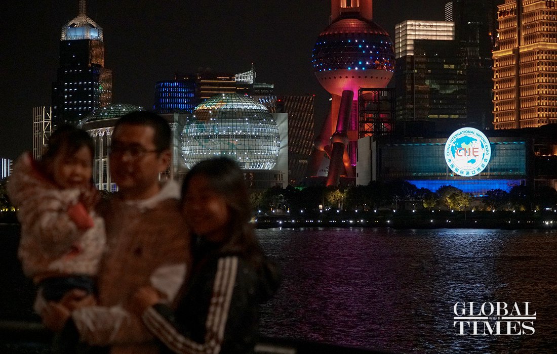 Welcome to CIIE! A light show at Shanghai Bund to celebrate the 2nd CIIE attracts tourists on Monday night. (Photos: Lu Ting/GT)