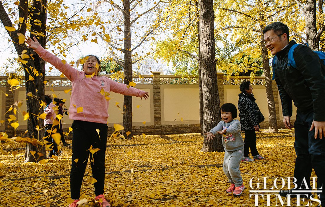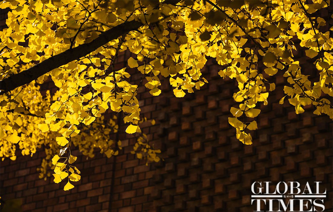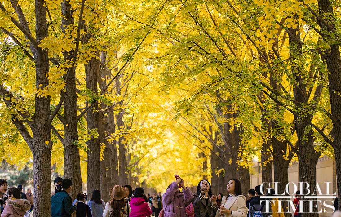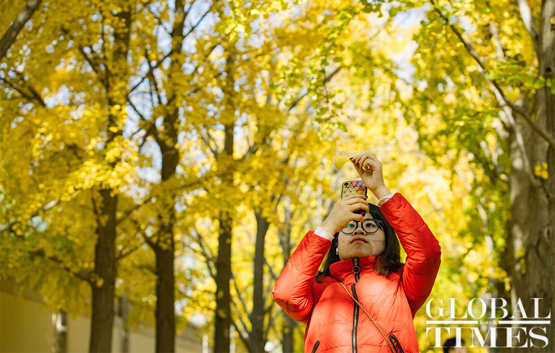 Hello yellow! Late autumn brightens Beijing with new color! Visitors enjoy the sight of golden ginkgo trees on a road near Diaoyutai State Guesthouse on Sunday.
