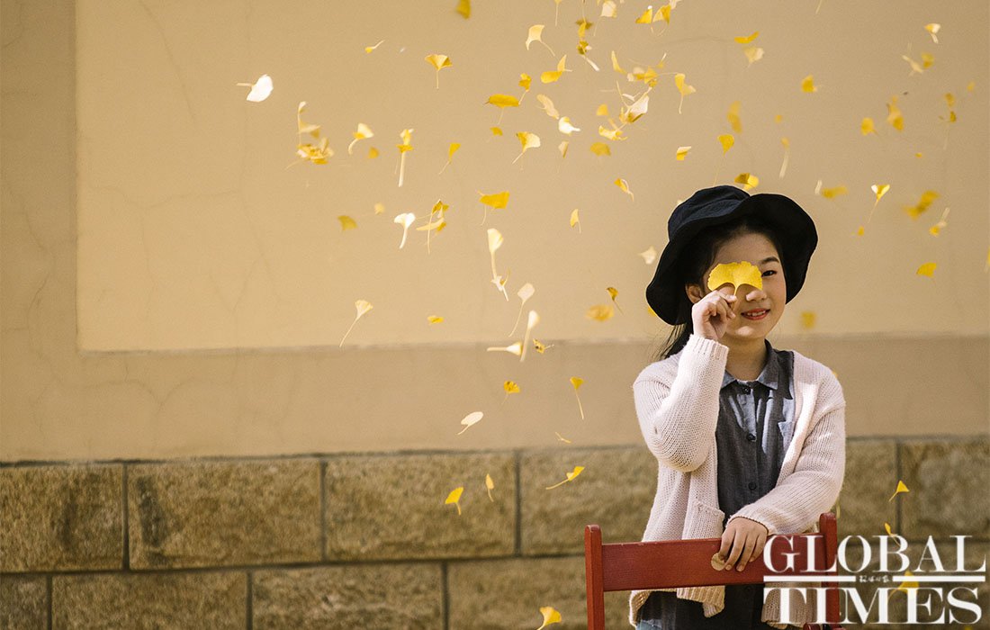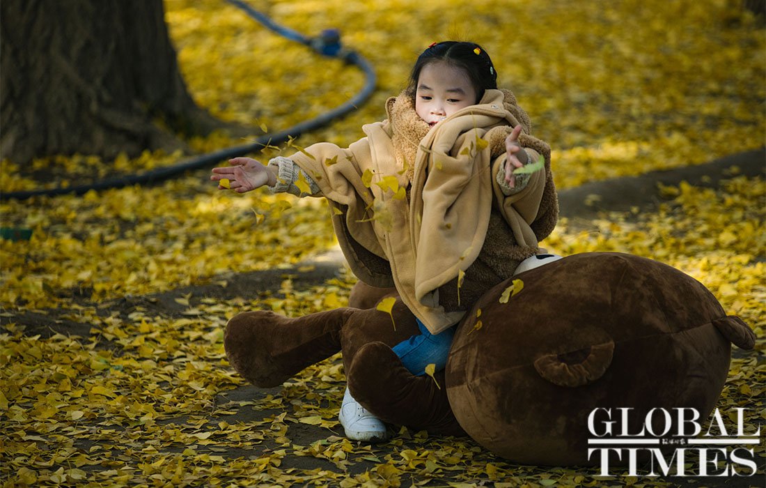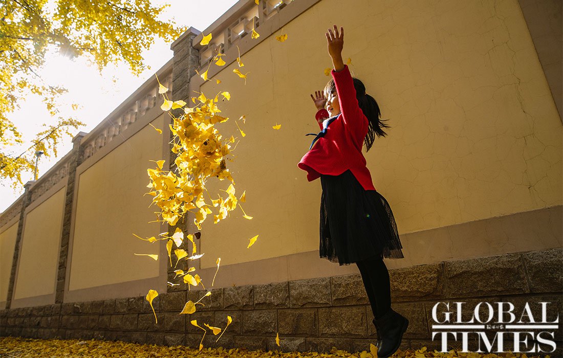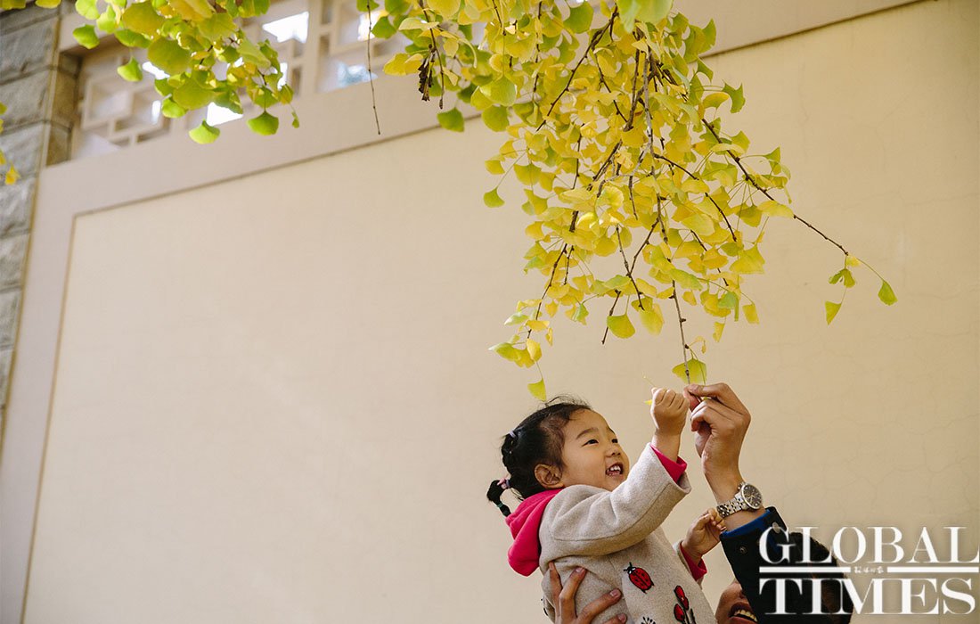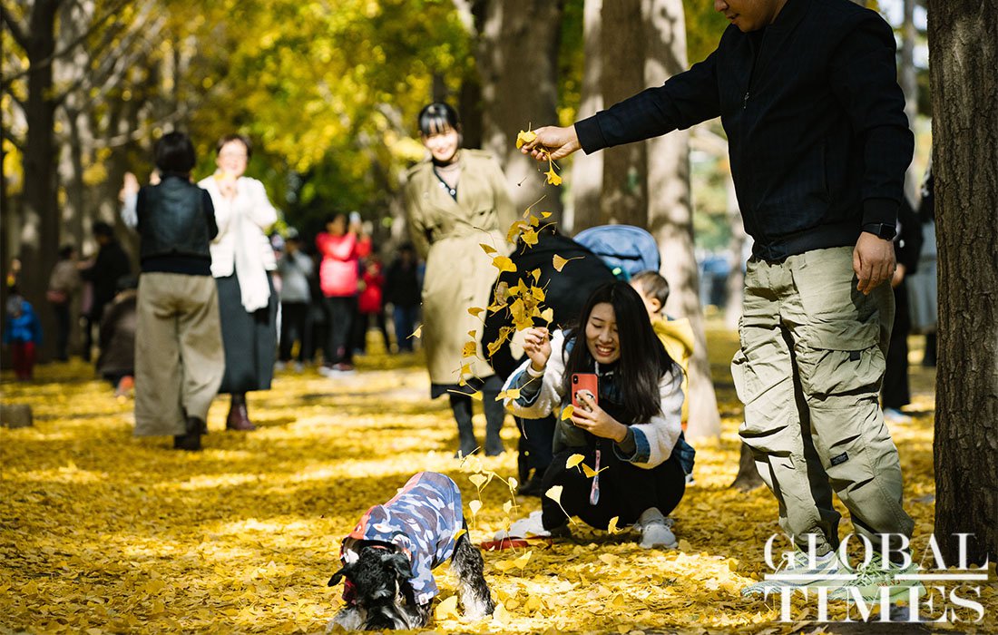 Hello yellow! Late autumn brightens Beijing with new color! Visitors enjoy the sight of golden ginkgo trees on a road near Diaoyutai State Guesthouse on Sunday.