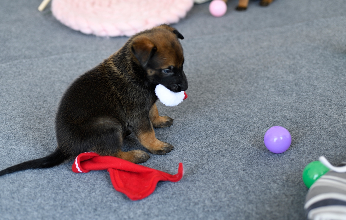 A file photo shows one of the puppies undergoing a training session. The six cloned dogs underwent training since the second week of their birth. Photo: Courtesy of Beijing Municipal Public Security Bureau figcaption >