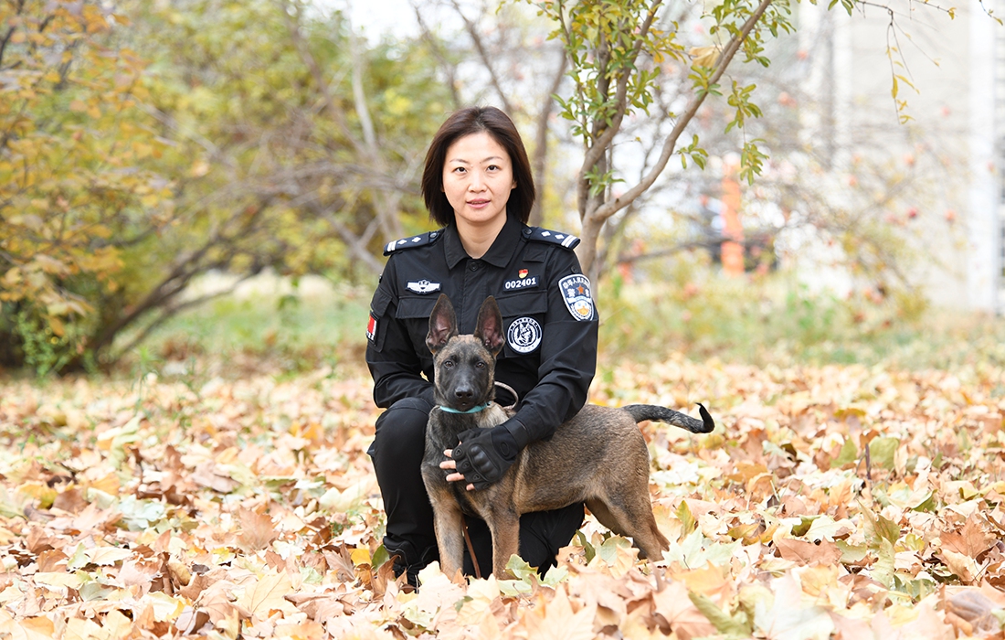 A policewoman poses for a photograph with one of the six cloned police dogs. Photo: Courtesy of Beijing Municipal Public Security Bureau figcaption >