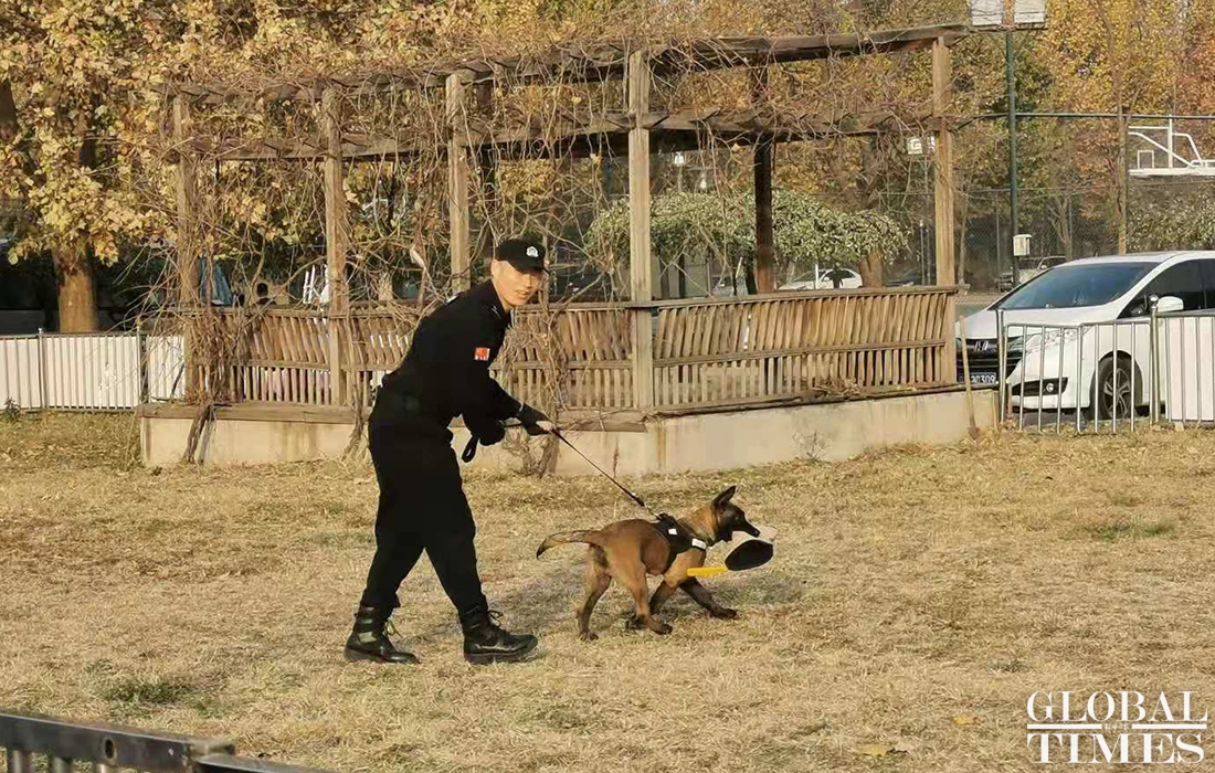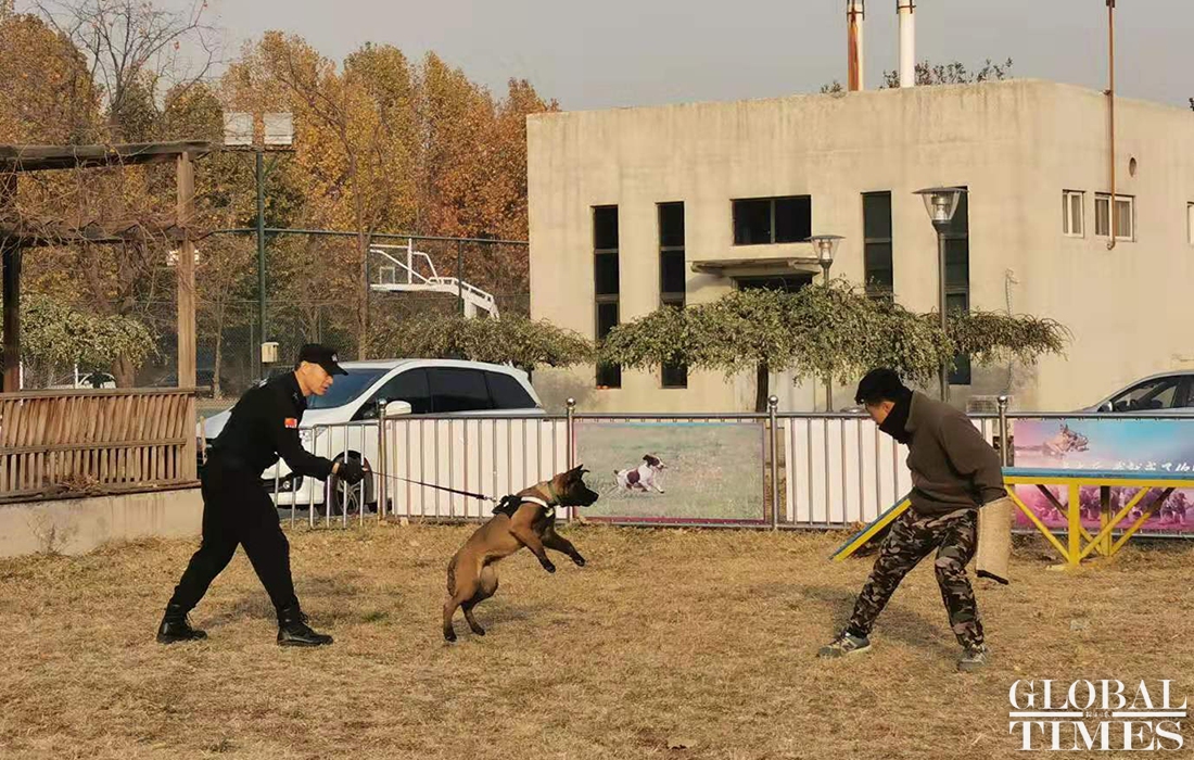 Cloned police dog and its handler display the canine training at a police base in Beijing. Photo: Xu Keyue/GT figcaption >