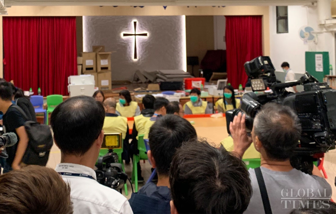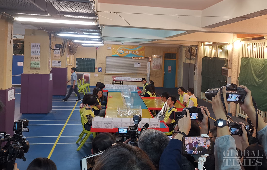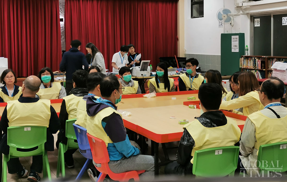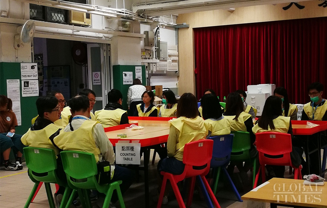 Staff members counted votes at multiple polling stations in Hong Kong late Sunday night after polls closed at 10:30 pm. And People crowded the polling station to watch the vote counting, almost filling the station before midnight. A record number of Hong Kong residents flocked to polling stations on Sunday to cast their vote in the 2019 Hong Kong District Council Election, as more people were encouraged to vote this year following months of protests that morphed into violent riots.