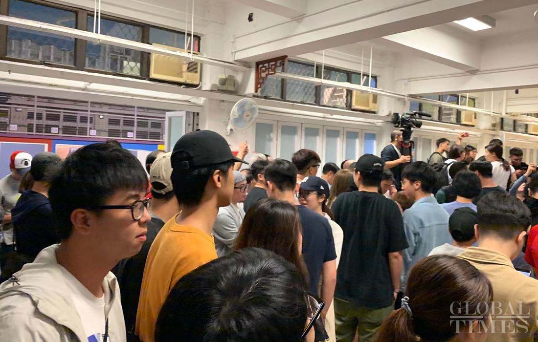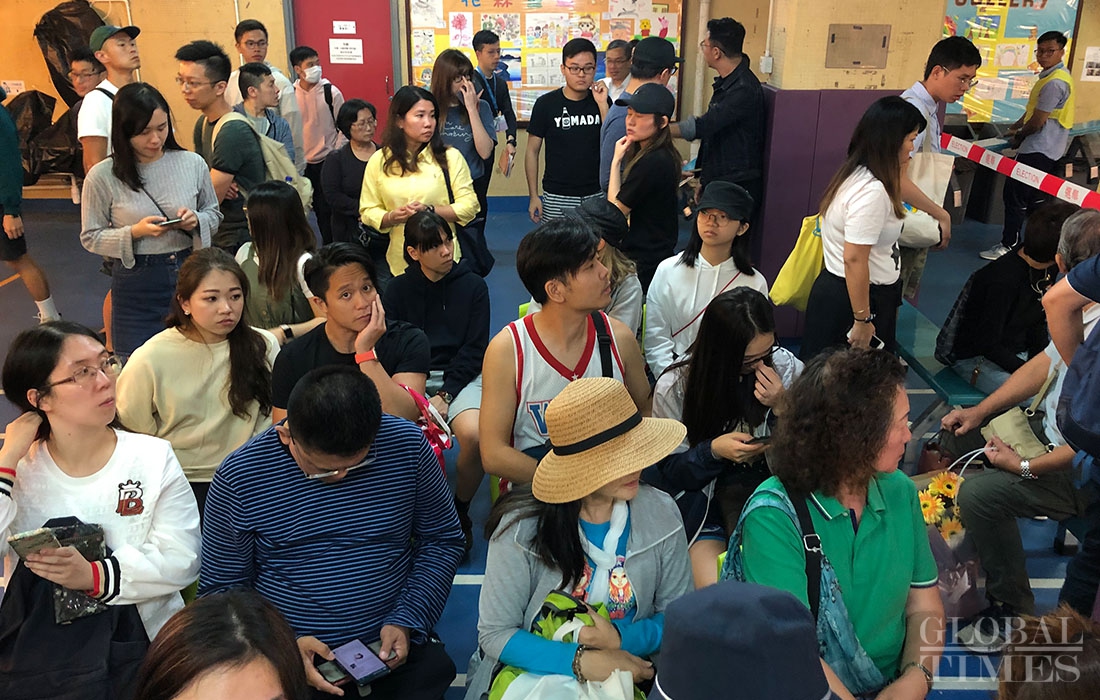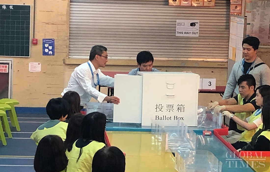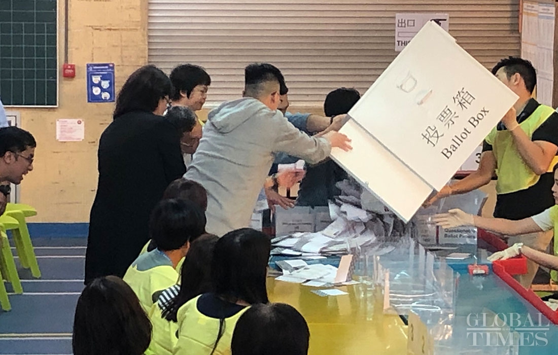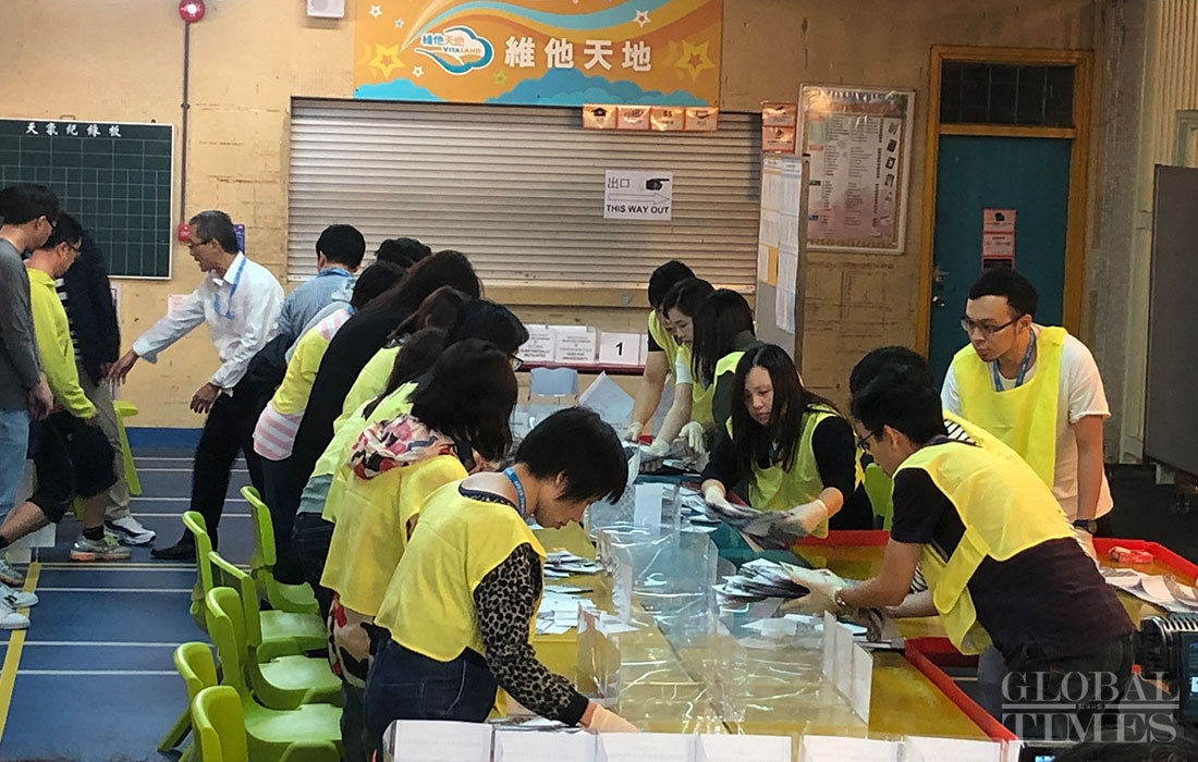 Staff members counted votes at multiple polling stations in Hong Kong late Sunday night after polls closed at 10:30 pm. And People crowded the polling station to watch the vote counting, almost filling the station before midnight. A record number of Hong Kong residents flocked to polling stations on Sunday to cast their vote in the 2019 Hong Kong District Council Election, as more people were encouraged to vote this year following months of protests that morphed into violent riots.