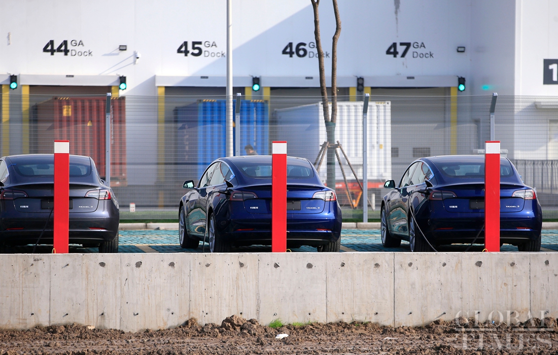 New cars are parked in the Tesla factory. (Photo: Yang Hui/GT) figcaption >