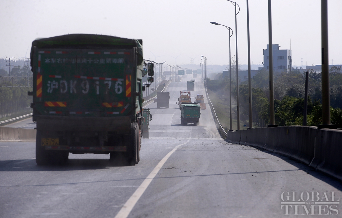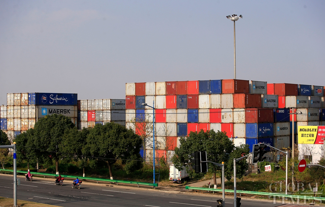 A massive container yard can be seen adjacent to the road in Lin-Gang Free Trade Zone. (Photo: Yang Hui/GT) figcaption >