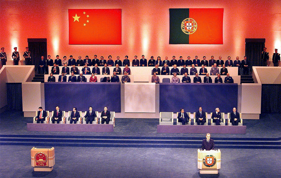 Portuguese President Jorge Sampaio (R) speaks at the Macao handover ceremony late December 19, 1999, minutes before the Portuguese colony reverted to Chinese rule. Macao returned to China at midnight, ending over four centuries of Portuguese administration. Photo: VCG figcaption >