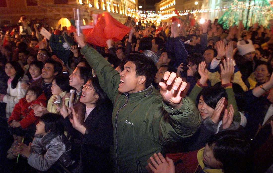 Macao residents burst into loud cheers moments after midnight, December 20, 1999 just after the handover of the former Portuguese enclave to China. Thousands of people packed into the Leal Senado Square to watch the festivities on a multi-screen giant TV display, waving flags and celebrating the event. Photo: VCG figcaption >