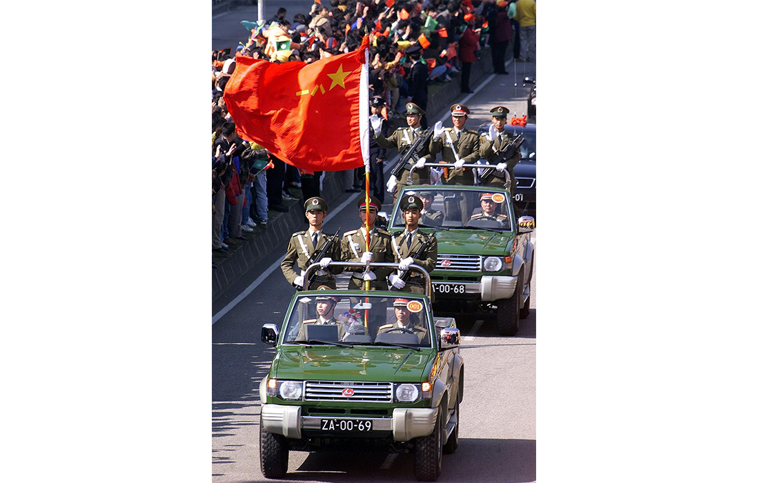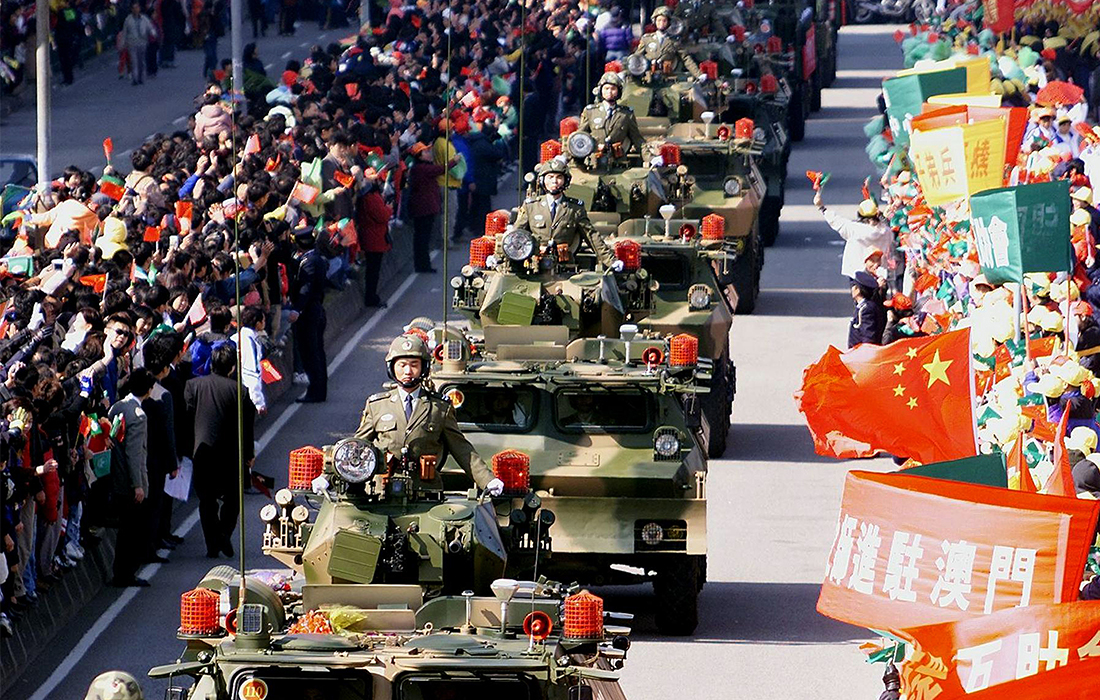 Chinese People's Liberation Army (PLA) troops wave to the people of Macao on December 20, 1999 as a parade of 500 Chinese troops swept across the border into Europe's last and oldest colony in Asia following the handover of Macao from Portuguese to Chinese rule. Photo: VCG figcaption >