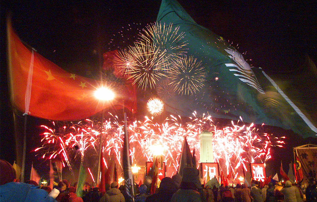 Thousands of Chinese brave the freezing cold on Beijing's Tiananmen Square waving Chinese and Macao SAR flags to celebrate as fireworks light up the night sky on December 20, 1999, marking the return of Macao to China. Beijing threw a party to celebrate the return of Macao despite chilly temperatures, boosting support among its people for a "full reunification" of China. Photo: VCG