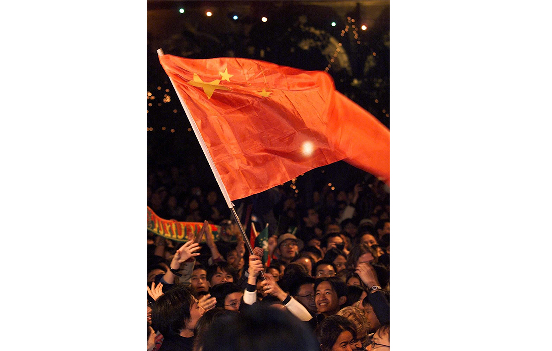Macao residents pass the People's Republic of China flag along as they burst into loud cheers moments after midnight, December 20, 1999 just after the handover of the former Portuguese enclave to China. Thousands of people packed into the Leal Senado Square to watch the festivities on a multi-screen giant TV display, waving flags and celebrating the event. Photo: VCG figcaption >