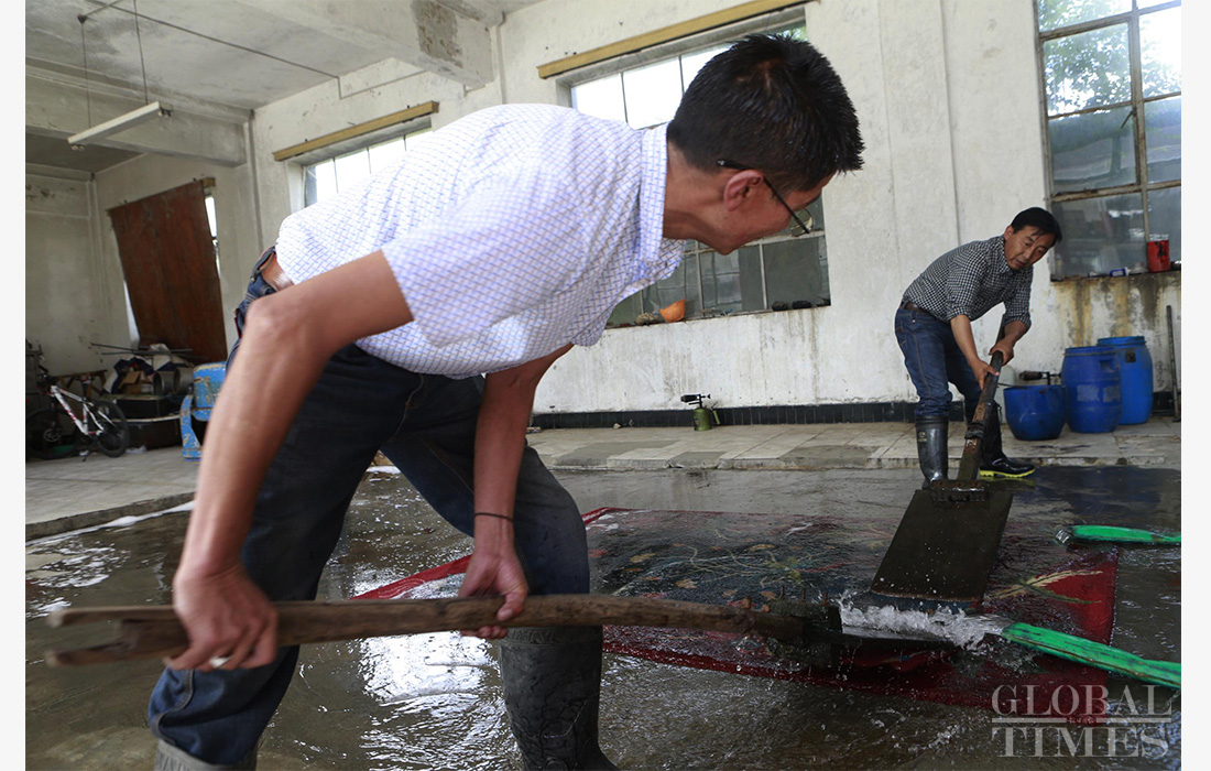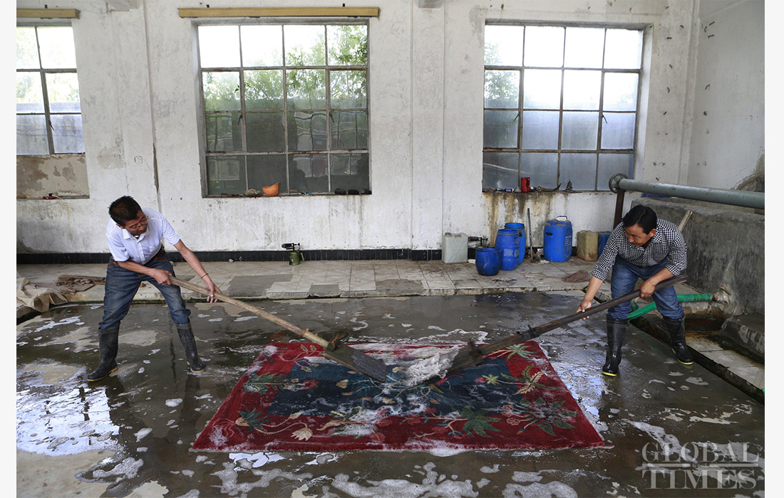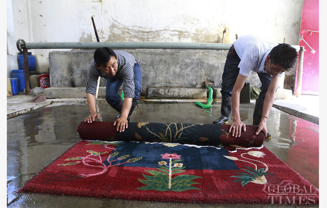 Two men roll up a freshly washed carpet. After being woven, the carpets go through a cleaning process. Because they are hand-woven, the carpets are stronger and can endure multiple stretches and washes. figcaption >
