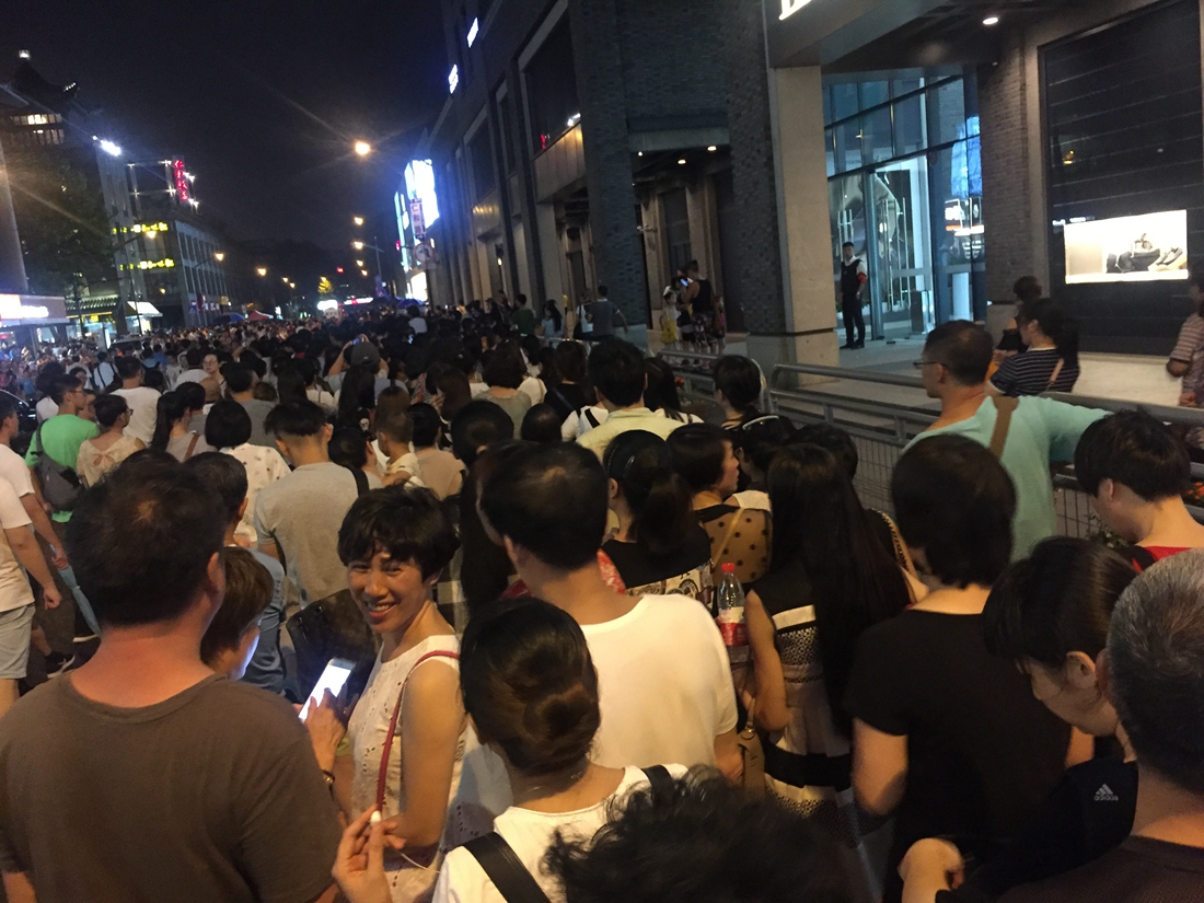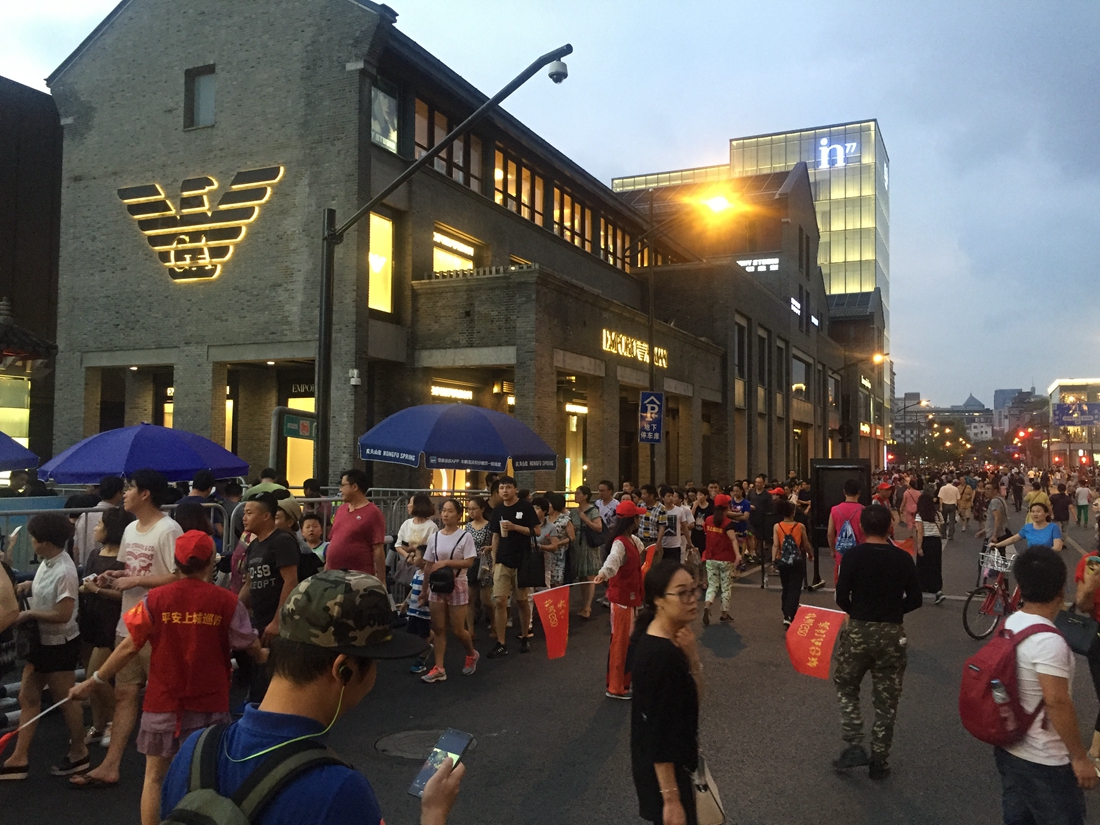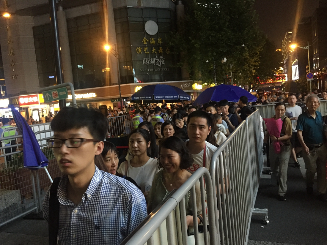 On the evening of May 26, 2016, people wait in line at the security check outside the West Lake. The queue moves slowly, and stretches long enough to reach around the block. figcaption >